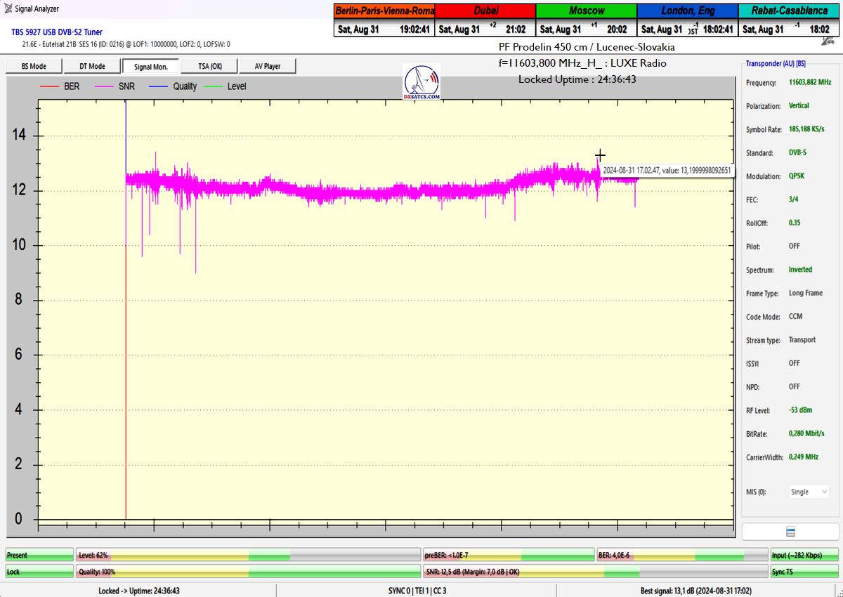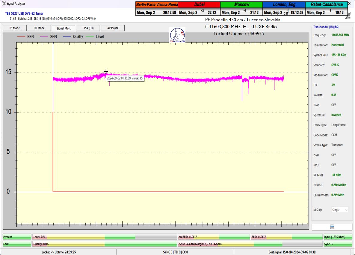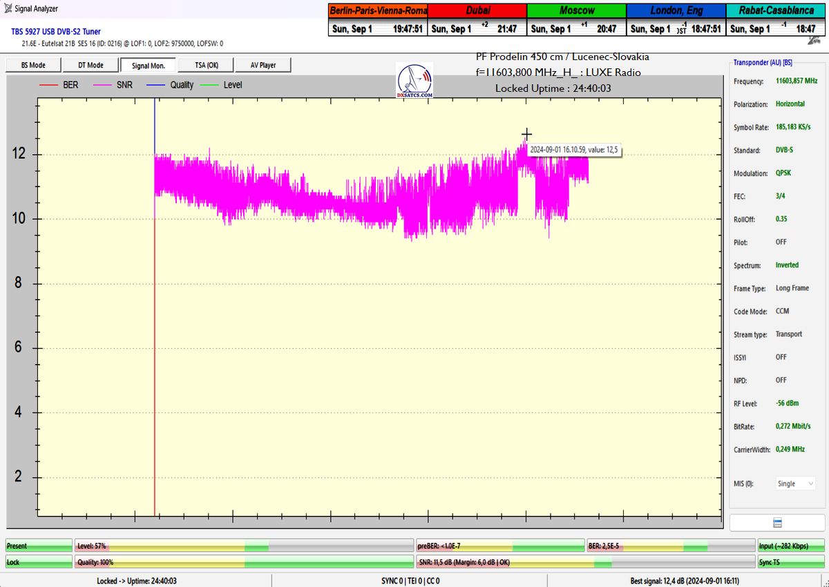 monitoringu t=136 hodín,pri špičke kvality SNR=15,5 dB na nosnej C/f=11 603,790 MHz-LUXE Rádio s hodnotou SR=185 ksym/s