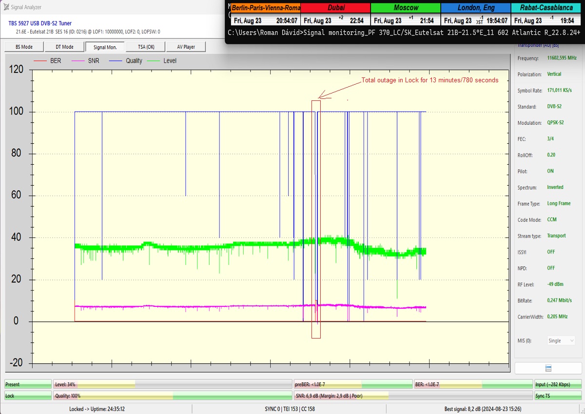 Odpoveď: keď sa spoja modrý priebeh kvality (poklesne na hladinu 0%) a červený priebeh chybovosti BER v osy X dochádza k okamžitému výpadku