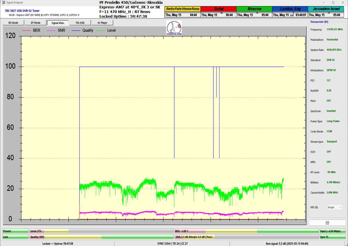 SNR = 6,3 dB, die noch vor dem Eintreffen mehrerer Gewitterwolken gemessen wurde.Der Verlauf der Empfangsstabilität war quasi ideal – ohne einen einzigen Lock-Verlust