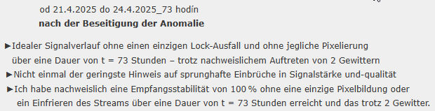 Ich habe die Ursachen der EIRP-Leistungsanomalie identifiziert und eliminiert, die über einen langen Zeitraum meine gesamte Forschung und jedes Signalüberwachungsmuster des YES-Netzwerks beeinträchtigt hat. Heute kann ich an einem Muster (bei f=10 758_V) und einem quasi-idealen Muster (bei f=10 722_V) zeigen, dass nach der Leistungsanomalie keine Spur mehr in der Signalüberwachung zu finden ist und die erhaltenen Muster genau die tatsächliche Leistung in Mitteleuropa widerspiegeln. Meine gesamte wissenschaftliche und Forschungsarbeit ist nun nicht mehr künstlich durch ein Problem beeinträchtigt, mit dem ich monatelang nicht zurechtkam, und die heute veröffentlichten Ergebnisse der Signalüberwachung sind der Beweis dafür.