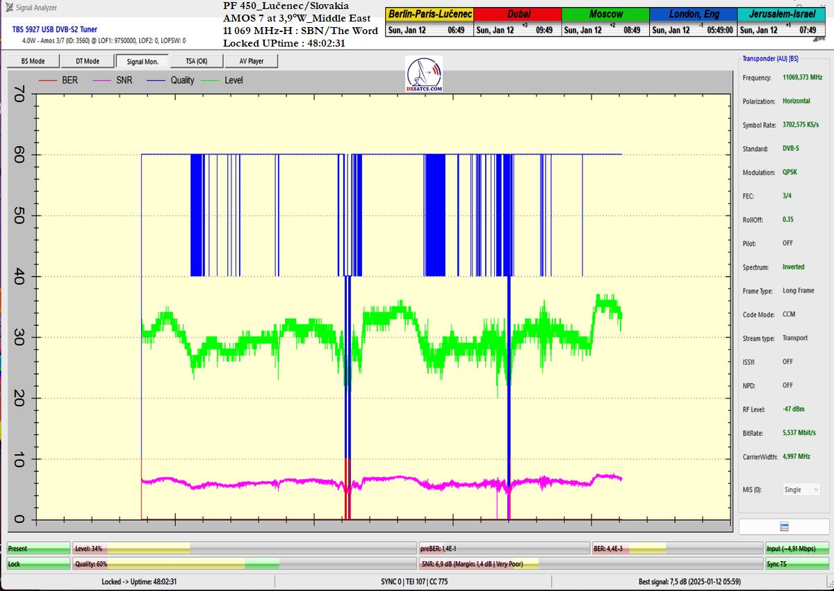 ►EN_From the perspective of achieving long-term signal stability on the SBN/The Word Network carrier, this represents the waveform with the highest channel bit error rate (ChBER) under Central European satellite reception conditions. In other words, it is one of the most technically complex satellite receptions overall. Despite snow showers at the reception site in Lučenec, I achieved signal stability exceeding 99% on f = 11,069 MHz-H within the verification unit t = 100+ h.