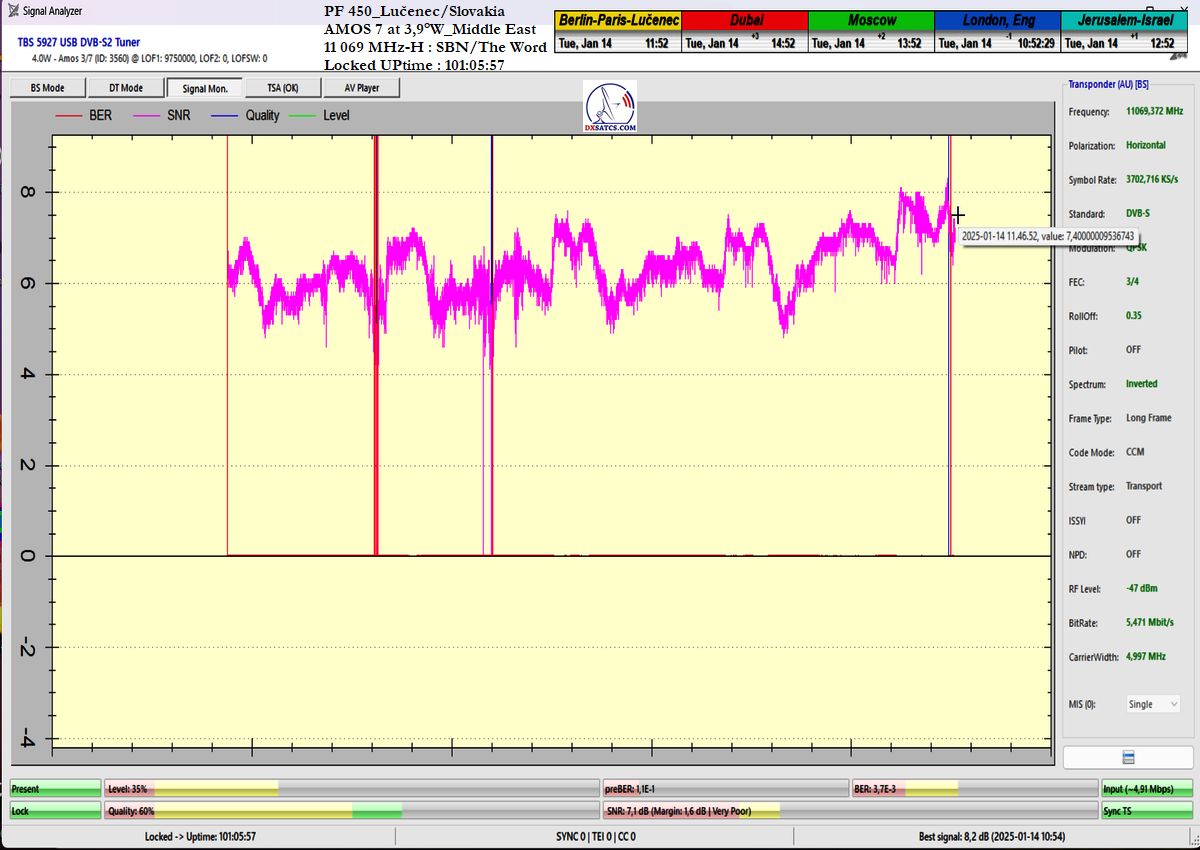 EN : The following spectrum and quality analyses with Televes H60 and Metek HD analyzers were conducted under significantly worse weather conditions, which is why the peak quality is far from the level achieved during the signal monitoring period of t=101 hours, i.e., around SNR=8.2 dB. These reception-quality-degrading weather conditions have persisted at the reception site in Lučenec since the conclusion of monitoring on January 14, 2025. To this day, I have been unable to perform spectrum and quality analyses under comparable weather conditions to those during the signal monitoring conducted from January 10 to 14, 2025.