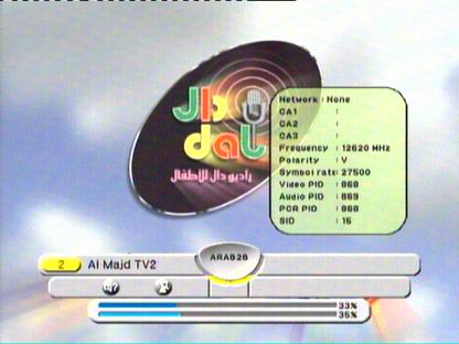 2,tp 6, 12 620 MHz, SR 27 500,FEC 3/4, názov Al-Majd Space Channel a Al-Majd Kids