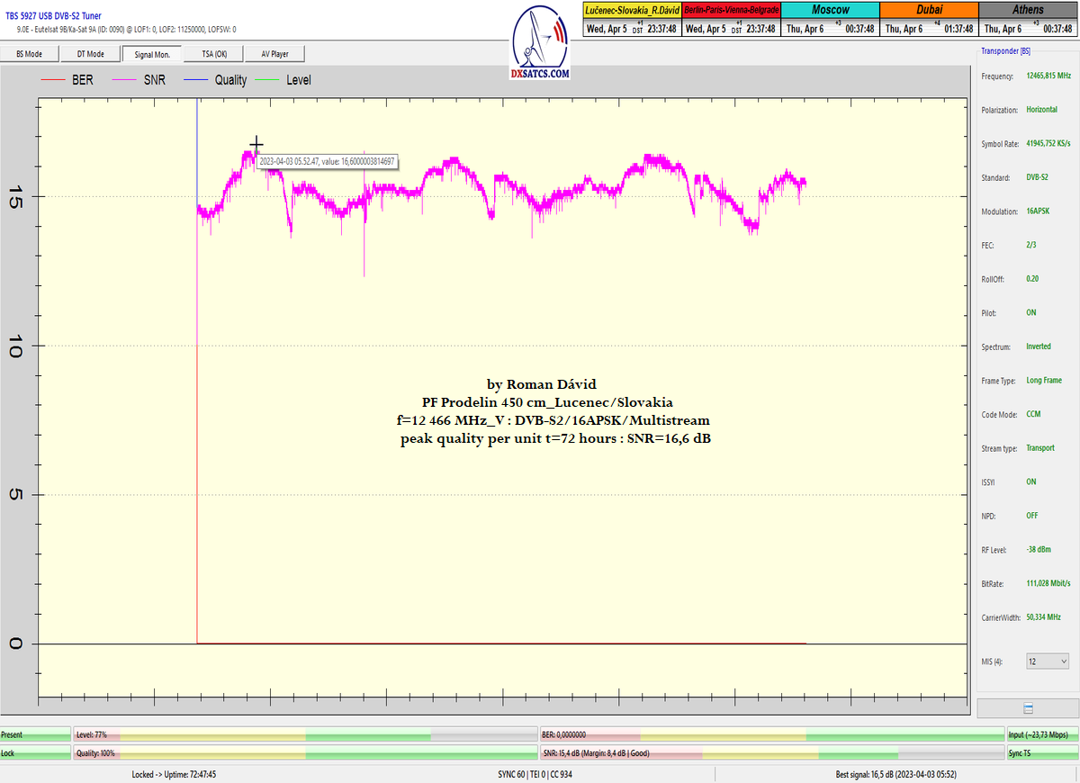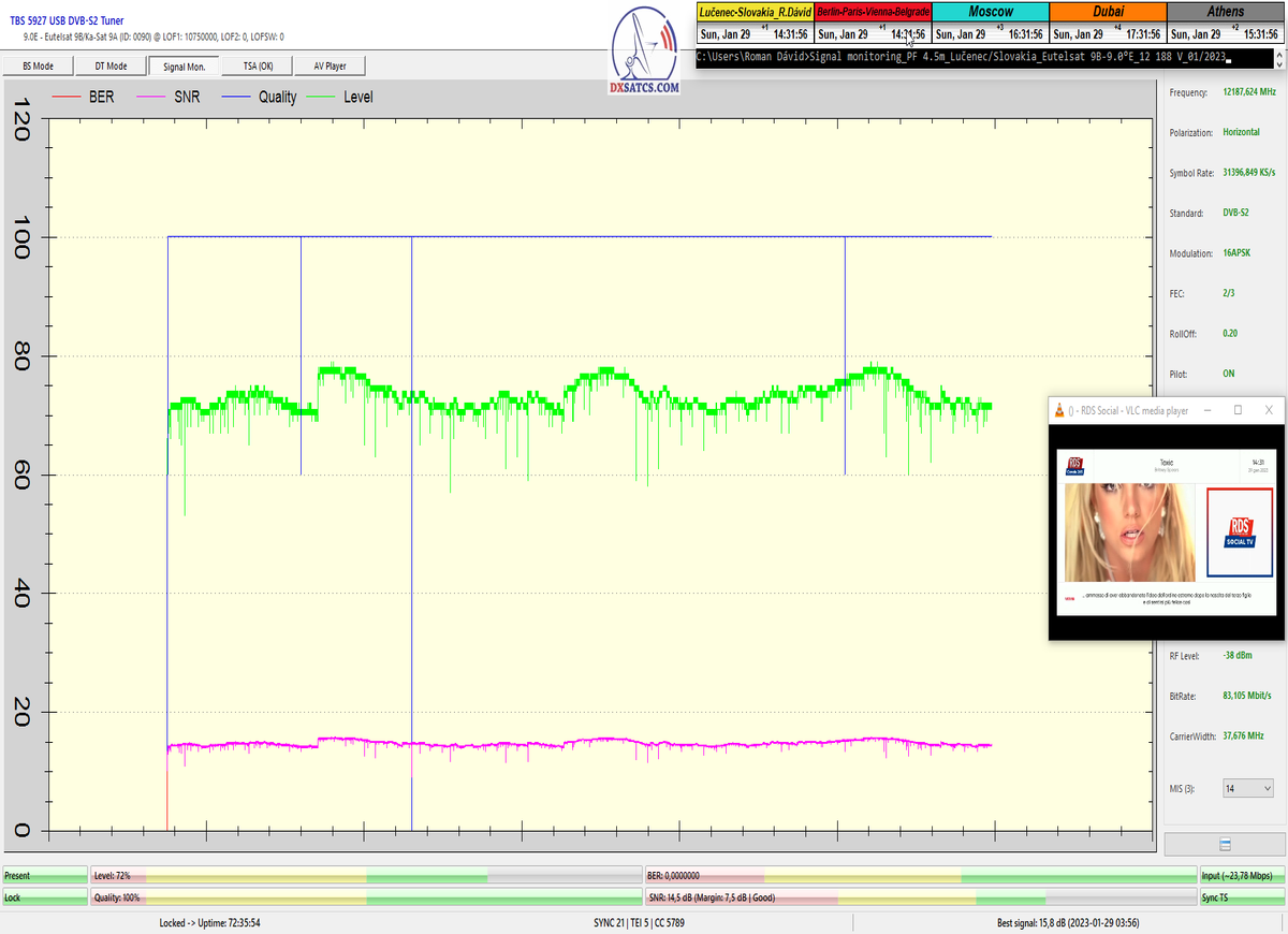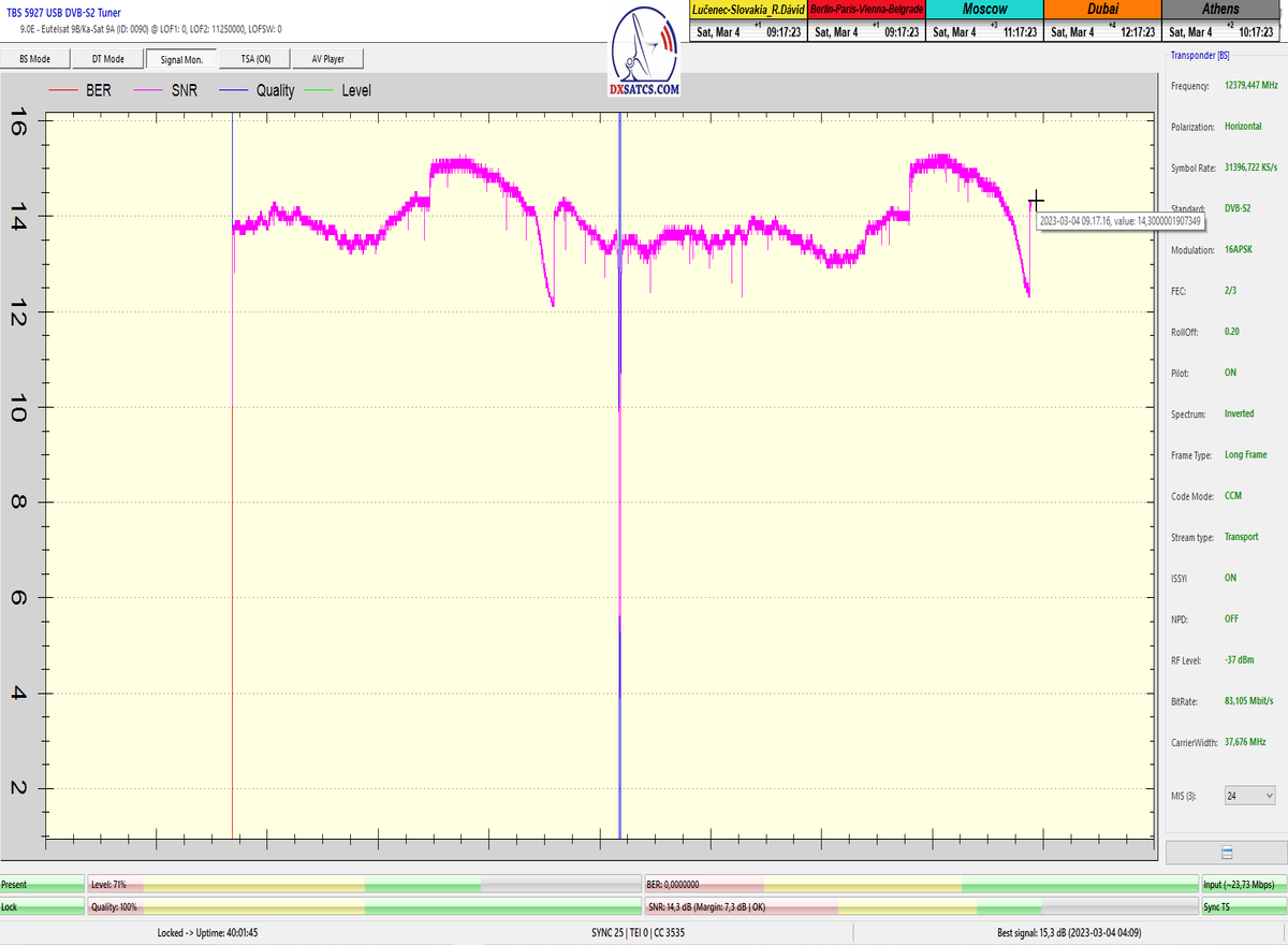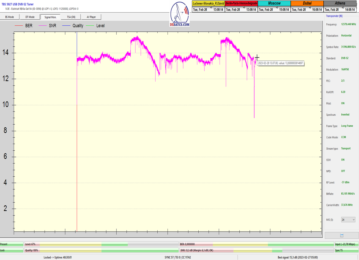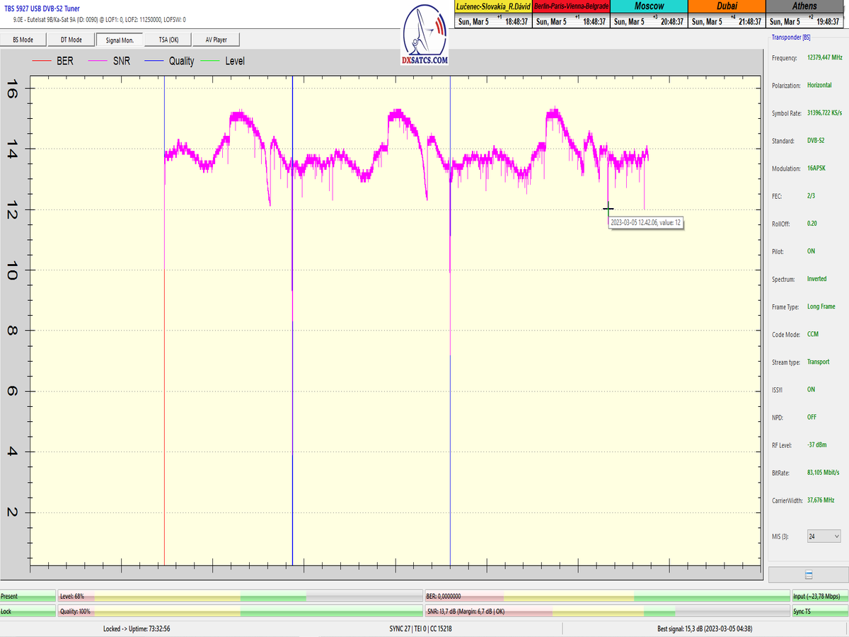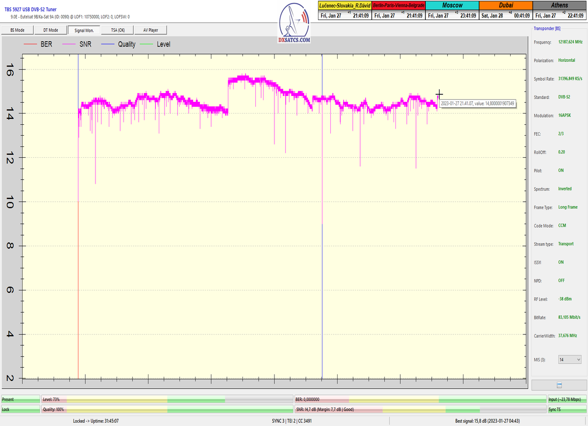 ►8.2.2023 : Na príklade dokazovania v signálnom monitoringu v dĺžke 1x73 hodín dnes nespochybniteľne dokážem začlenenie frekvencie f=12 188 MHz_V do DTH kategorizácie štandardnej formy konštantne stabilného satelitného príjmu (99,999%) s doteraz najvyššou špičkou kvality okolo SNR=15,8 dB ktorá sa opakuje každý deň.Z technologickej stránky je príjem z TP IT3 výnimočný hlavne tým že veľkosť uhlovej odchýlky SKEW ostáva konštantná aj pri výrazných zmenách v poveternostných podmienkach.Ďalej dnes dokážem plnú stabilitu príjmu v štandarde DVBS2-16APSK-Multistream aj pri intenzívnom snežení dňa 27.1.2023 so stabilnou výškou kvality okolo SNR=14,3 dB atď