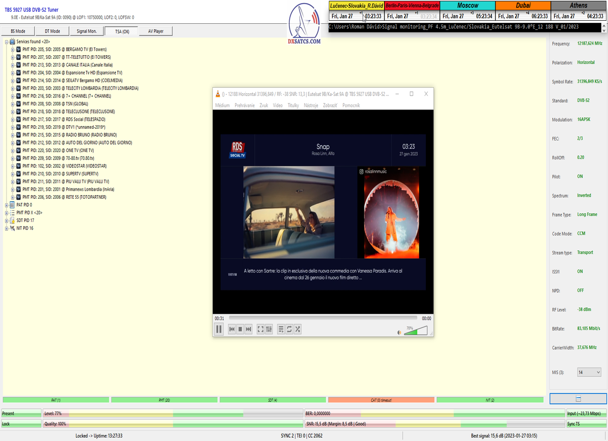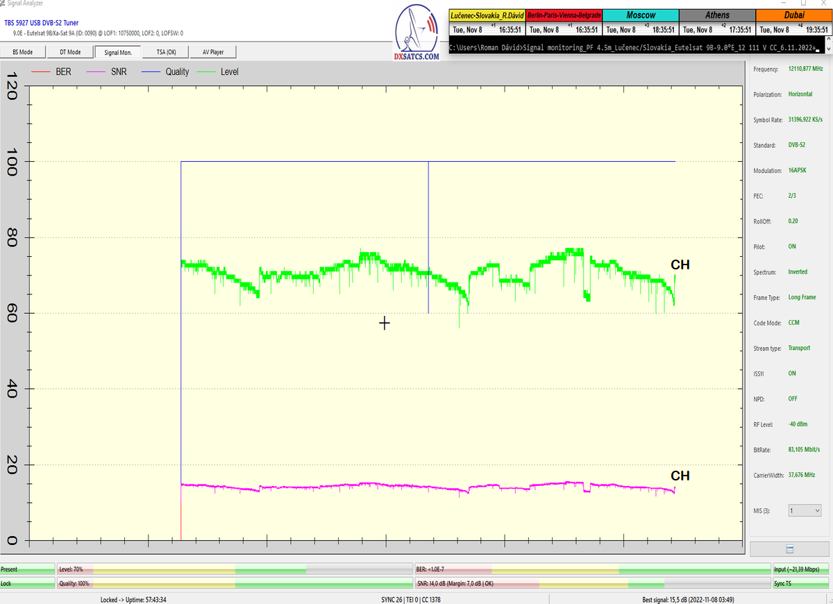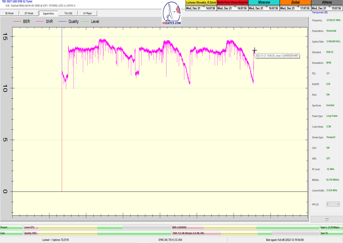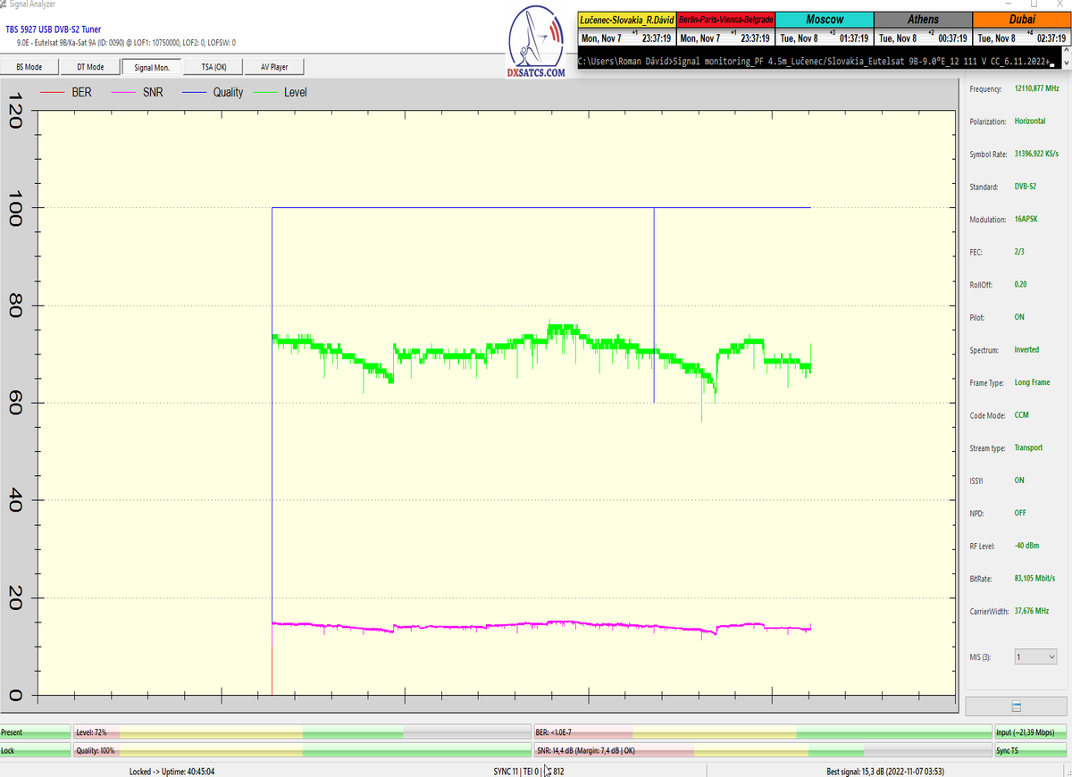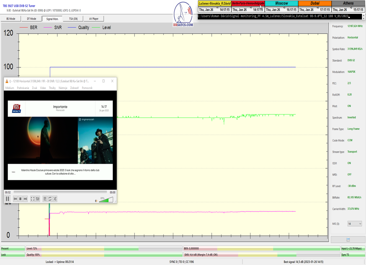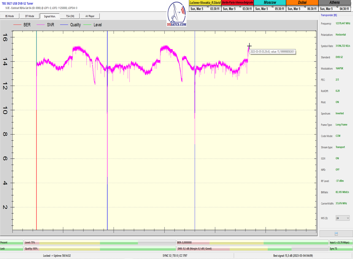 ►8.2.2023 : Na príklade dokazovania v signálnom monitoringu v dĺžke 1x73 hodín dnes nespochybniteľne dokážem začlenenie frekvencie f=12 188 MHz_V do DTH kategorizácie štandardnej formy konštantne stabilného satelitného príjmu (99,999%) s doteraz najvyššou špičkou kvality okolo SNR=15,8 dB ktorá sa opakuje každý deň.Z technologickej stránky je príjem z TP IT3 výnimočný hlavne tým že veľkosť uhlovej odchýlky SKEW ostáva konštantná aj pri výrazných zmenách v poveternostných podmienkach.Ďalej dnes dokážem plnú stabilitu príjmu v štandarde DVBS2-16APSK-Multistream aj pri intenzívnom snežení dňa 27.1.2023 so stabilnou výškou kvality okolo SNR=14,3 dB atď