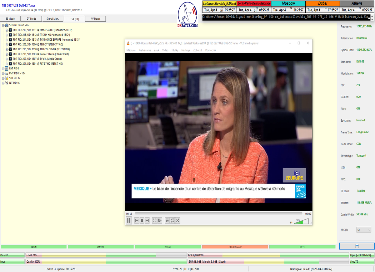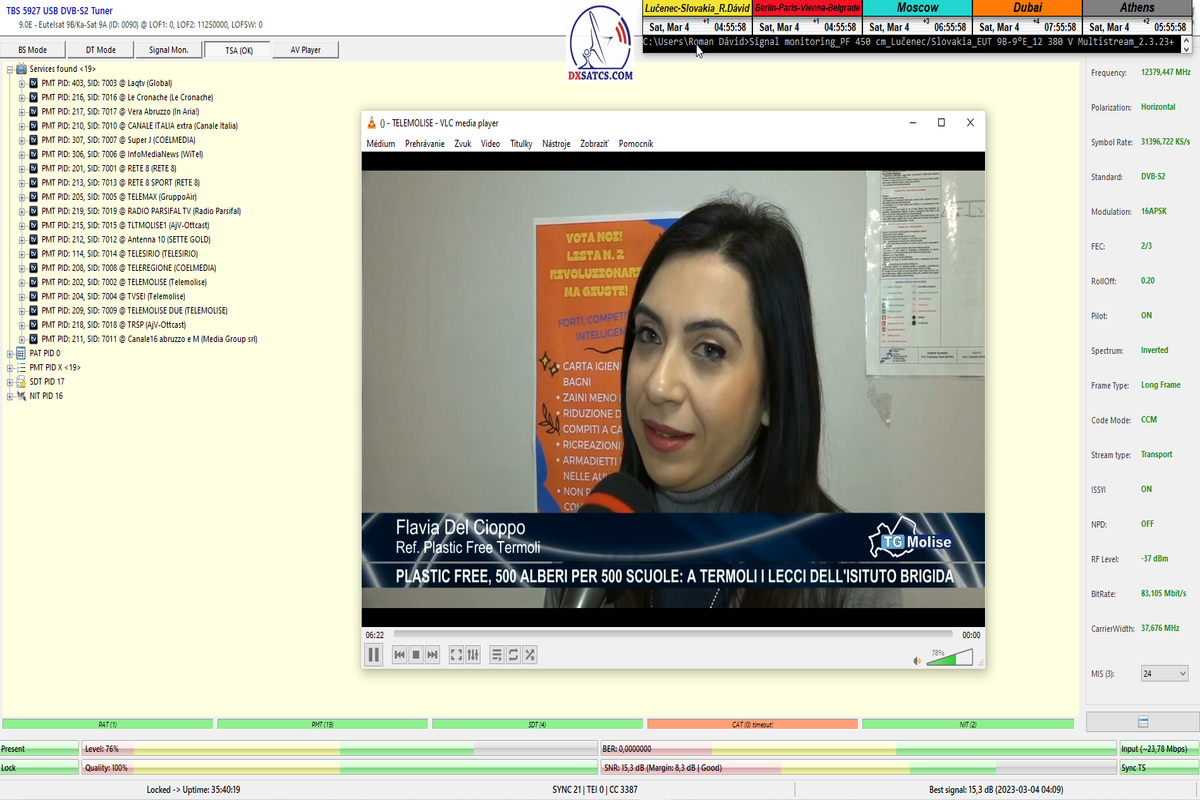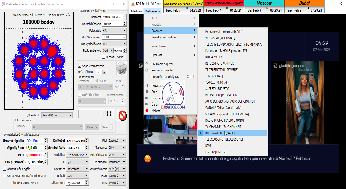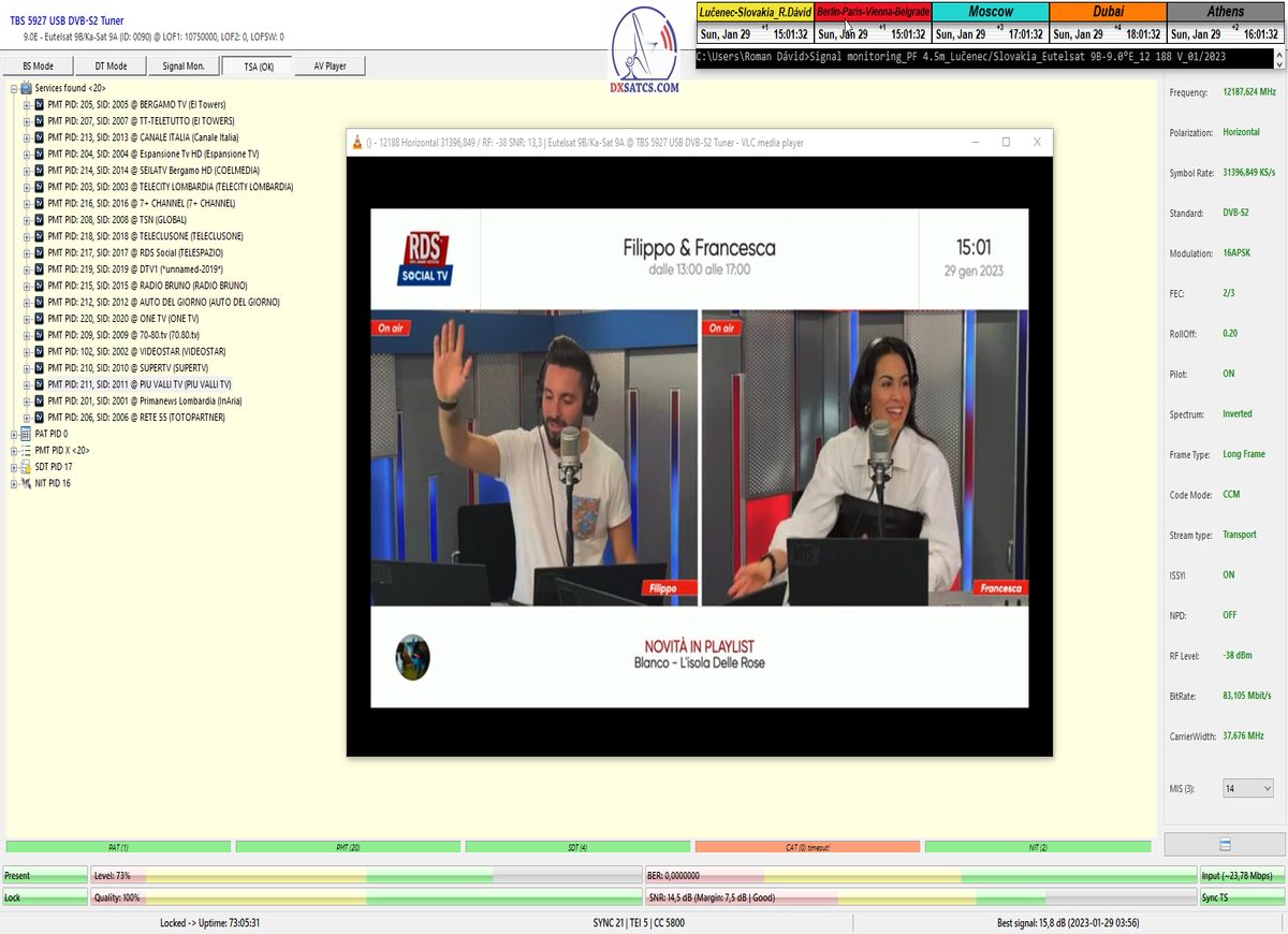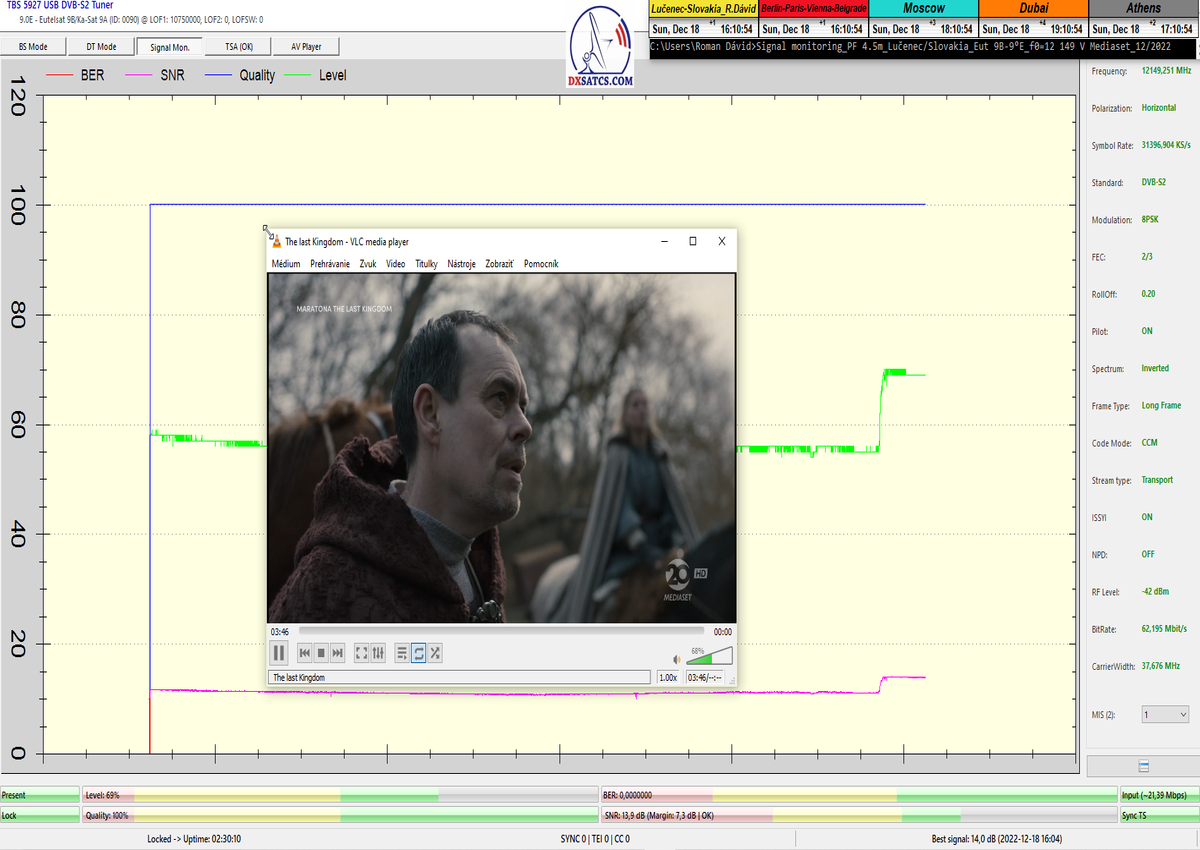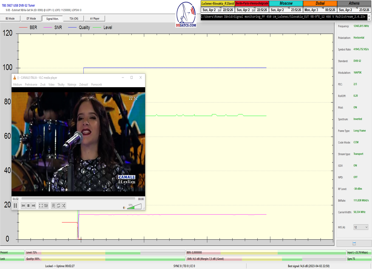 ►8.2.2023 : Na príklade dokazovania v signálnom monitoringu v dĺžke 1x73 hodín dnes nespochybniteľne dokážem začlenenie frekvencie f=12 188 MHz_V do DTH kategorizácie štandardnej formy konštantne stabilného satelitného príjmu (99,999%) s doteraz najvyššou špičkou kvality okolo SNR=15,8 dB ktorá sa opakuje každý deň.Z technologickej stránky je príjem z TP IT3 výnimočný hlavne tým že veľkosť uhlovej odchýlky SKEW ostáva konštantná aj pri výrazných zmenách v poveternostných podmienkach.Ďalej dnes dokážem plnú stabilitu príjmu v štandarde DVBS2-16APSK-Multistream aj pri intenzívnom snežení dňa 27.1.2023 so stabilnou výškou kvality okolo SNR=14,3 dB atď