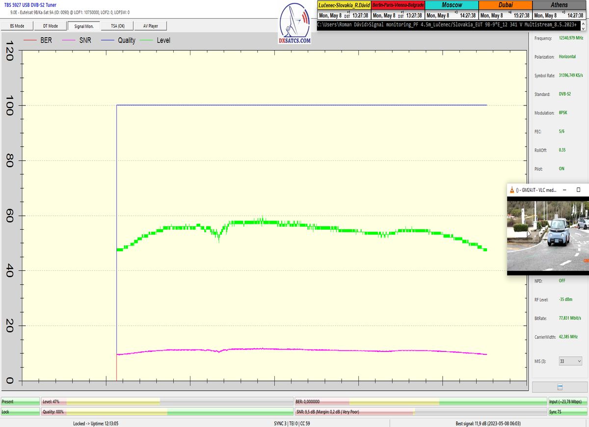 ►Priebežné stavy v signálnom monitoringu na f=12 341 MHz_V sa dokazujú v online video ukážkach,ktoré sa nedajú spochybniť.Kedže z principiálneho hľadiska platí že "Všetko sa dá spochybniť" moje argumenty znejú nasledovne : Signál s dostatočnou kvalitou sa nedá "svojpomocne vyrobiť " a priebehy a okamžité úrovne SNR,BER,Pwr... demonštrované v online video ukážkach sa nedajú zobrazovať a ani dodatočne upravovať v OFF-LINE režime,pretože ten neexistuje.To je dôvod prečo tak zdôrazňujem slovo ONLINE video ukážka