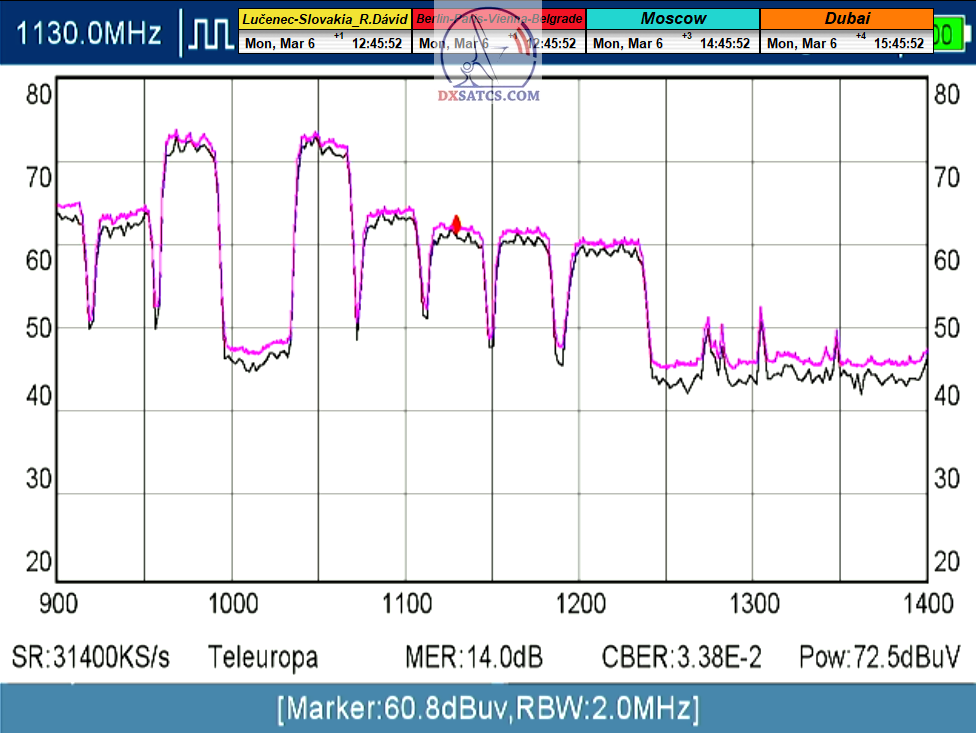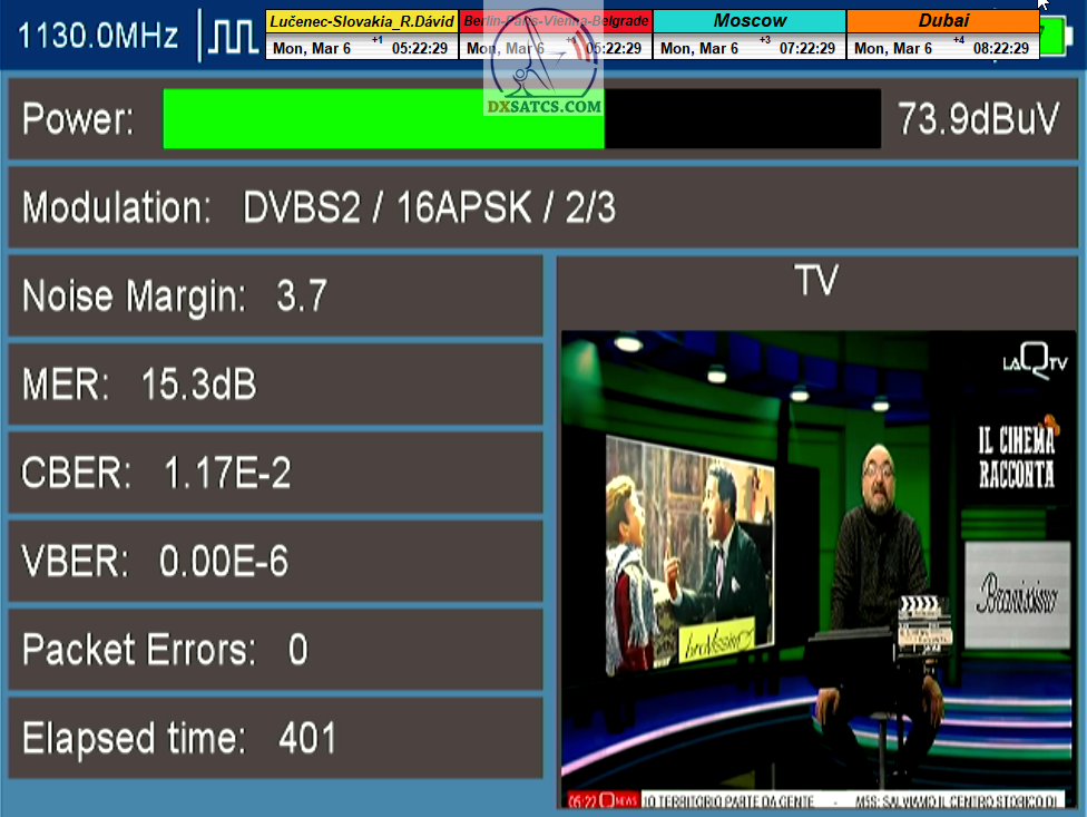s verifikáciou stredoeurópskeho času v TV vysielaní,napríklad v SKY TG24,pretože to je dôkazom o reálnosti signálnej kvality,ktorú som v meste Lučenec dosiahol.Ak by niekto spochybňoval hladiny SNR zo samotného SW EBSpro,potom na dôkaz vyvrátenia týchto pochybností ponúkam ďalšie 3 signálne zdroje ako napríklad analyzátor Metek HD,4K receiver Octagon,SW CrazyScan a pochybnosti všetkého druhu sú razom blízke alebo rovné NULE. Ospravedlňujem sa za môj slovník určený pre publikum s určitou mierou "mentálnej invalidity alebo mentálneho postihnutia",ale občas je vhodné zopakovať si aj elementárnu abecedu,pretože nie každý čitateľ pochádza z odbornej alebo vedeckej sféry a moje vysvetlenie smerujem aj do radov takzvaných