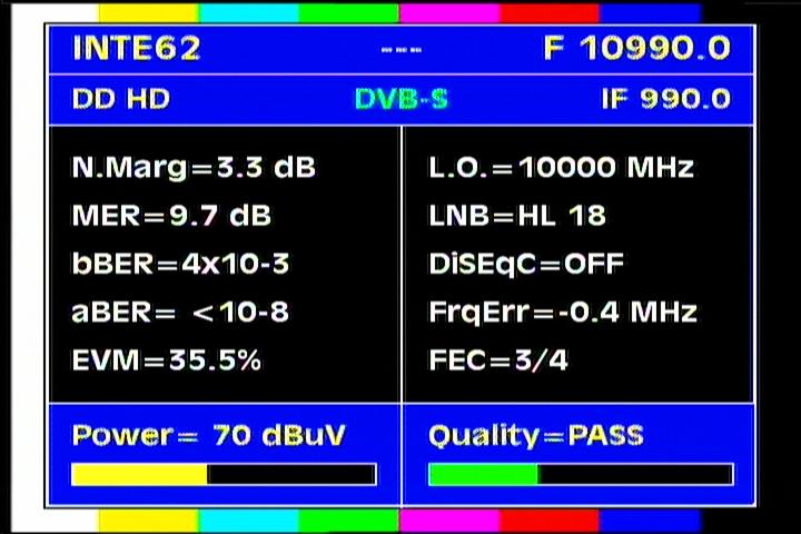 of reception follows.Average reception quality, expressed in the unit MER=9.5-11.5 dB (with occasional peak at MER=15+ dB)