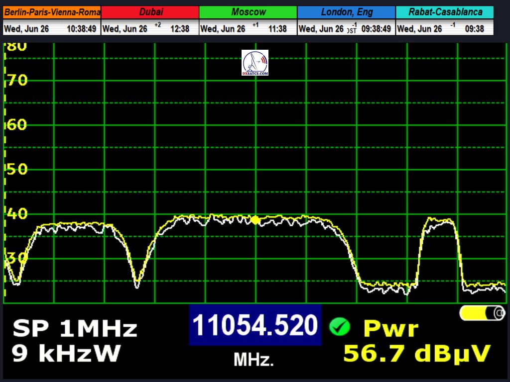 radio carrier Q-Music NL AMS at f=12,567.994 MHz through LOF2 and 12,567.941 MHz through LOF1, resulting in an offset of exactly 53 kHz between
