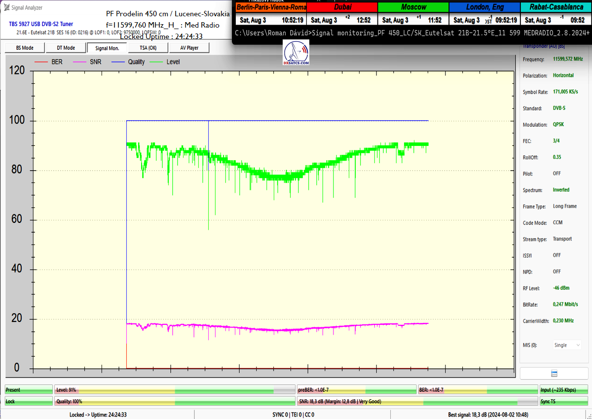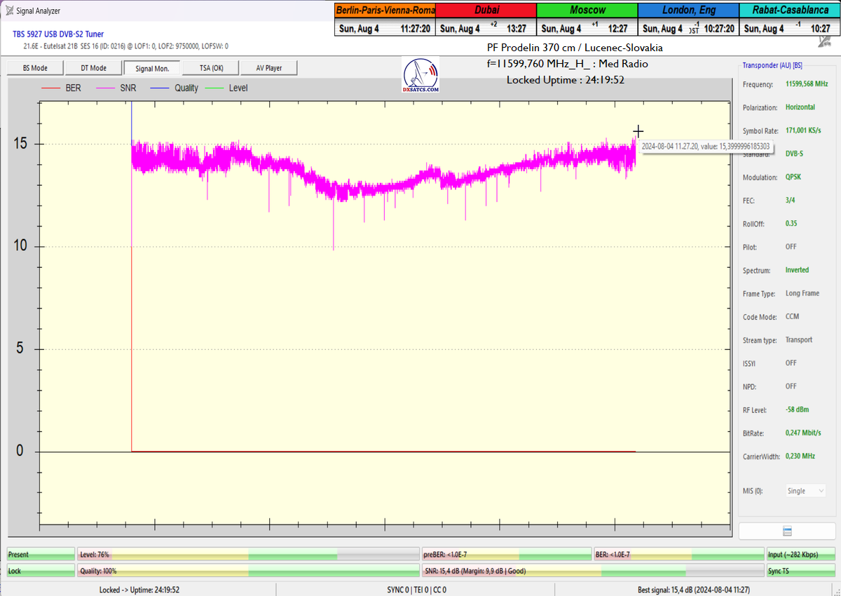 ►Eng_Classification of achieved results at f=11 599,760 MHz: Signal monitoring over a unit length of t=72 hours irrefutably proves that I have achieved 100% reception stability in practice, without a single interruption in Lock continuity throughout the entire monitoring period. The daily peak quality oscillated around an SNR of 18.4 dB, which provides an immediate quality margin of nearly 13 dB with, of course, a zero level of Viterbi Precorrection <1.0E-7. Occasional drops in instantaneous quality never exceeded an SNR of 9.7 dB.