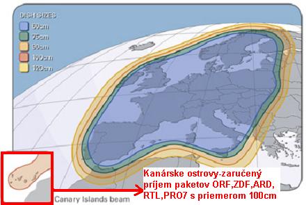Nakoľko družica Astra 3A na orbitálnej pozícii 23,5°E plni úlohu záložnej družice k sústave družíc ASTRA 1C -2C na 19E a v globále sa väčšina prenosov distribuje pre káblove rozvody v NEMECKU aj vyžarovaci diagram je pomerne úzko smerovaný do oblasti Strednej Európy kde sa sústredí maximum vyžiarenej energie EIRP viac ako 50 dBW a smerom na západ -Francúzsko,Španielsko.....Kanárske ostrovy úroveň vyžiarenej energie prudko klesá,čo súvisí s potrebou zvyšovania priemeru príjmacej antény. Z vlastnej skúsenosti /Las Palmas-Gran Canaria/ Vám možem povedať že s priemerom 240 cm sa na Kanárskych ostrovoch nedosiahol ani len náznak meratelnej signálnej kvality určenej úrovňou Modulačnej chyby MER v analyzovanom spektre na f=12 565 MHz-SkyLink , čiže jediným riešením ostáva osloviť v danej oblasti osobu,ktorá vlastní vysoko ziskovú príjmaciu antenu s priemerom od 300 do 500 cm /sú ich tam namontovaných desiatky kusov väčšinou na príjem ASTRY 2D 28,2 °E/ a navrhnúť jej či by príjem vo vašej oblasti nemohla vyskúšat a potom budete s istotou vedieť či sa v danej lokalite dá zachytiť paket SkyLInk alebo NIE. Je lepšie sa vopred presvedčiť na inej satelitnej zostave so zaručeným ziskom k priemeru antény či je vo vašej oblasti vôbec šanca zachytit paket SKyLink ako najskôr investovať 3-5000 EUR do kúpy antény a potom nezachytit NIČ.