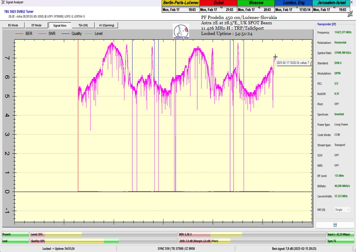 ►DE_TRP/TalkSport: Nachweislich hohe Gewinnsteigerungen von über 2 dB bei der Replikation des Signalmusters in das Antennensystem mittels meiner Technologie "Synchronisierte Nanokorrektur" beim Empfang des Transponders TP 115 von Satellit Astra 2E auf 28,5°E im UK SPOT BEAM-Bereich in Lučenec im Süden der zentralen Slowakei, mit einem Ausgang von einer 450 cm Antenne.