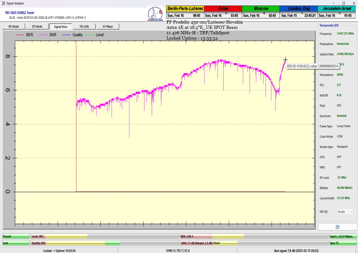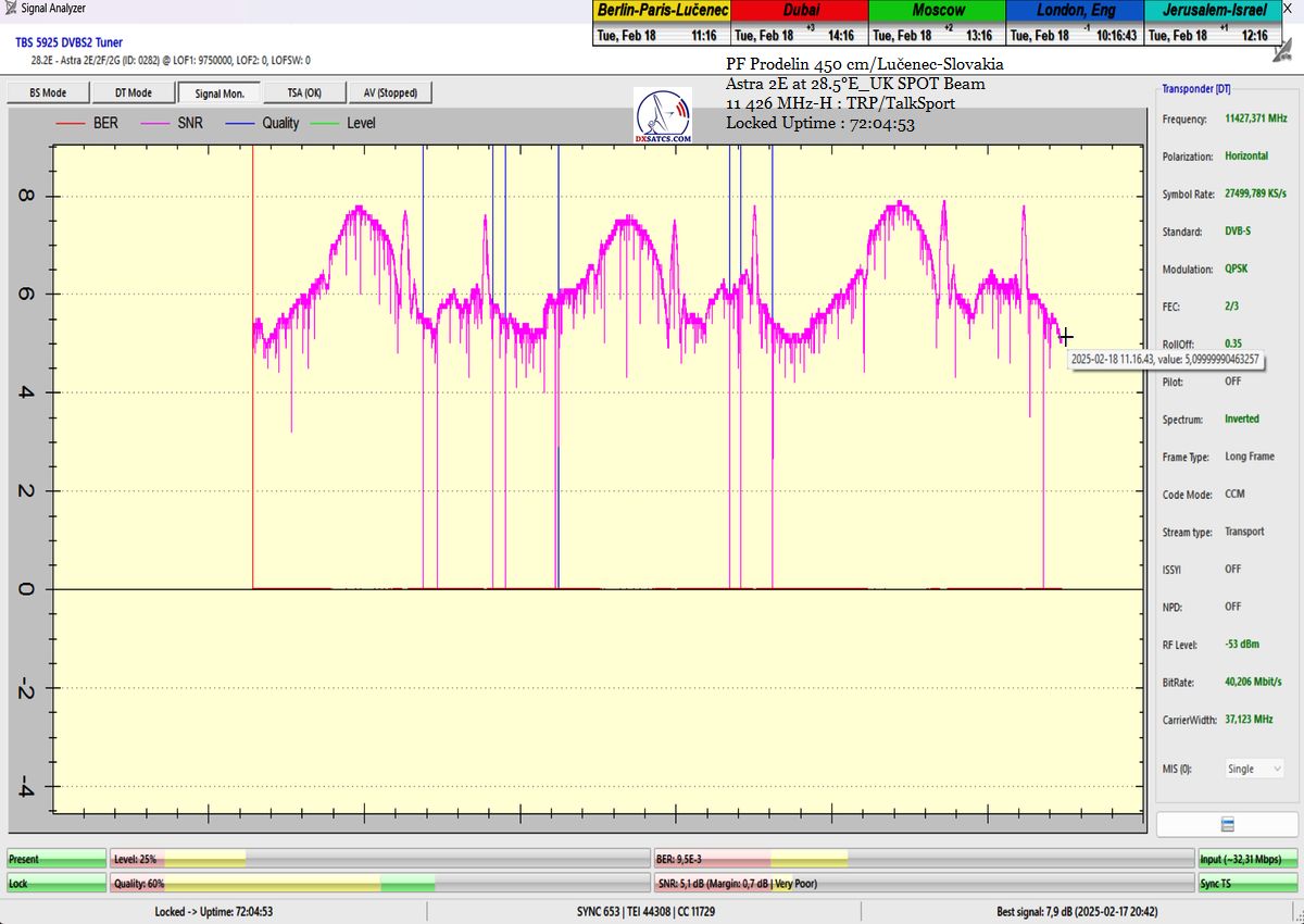►EN_TRP/TalkSport: Demonstrable high profit gains of over 2 dB when replicating the signal model into the antenna system using my technology "Synchronous Nanocorrection" while receiving transponder TP 115 from satellite Astra 2E at 28.5°E in the UK SPOT BEAM footprint in Lučenec in southern central Slovakia, with an output from a 450 cm dish.