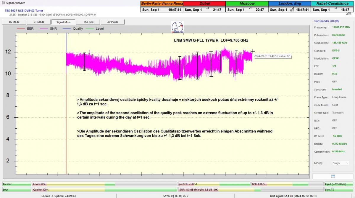 11-9-2024_LUXE Radio: Today, I can demonstrate 100% reception stability on each of the 3 applied oscillators over a total monitoring period of t=136 hours, with a quality peak SNR=15.5 dB on the LUXE Radio, with an SR value of 185 ksym/s