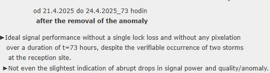 Po technickom zásahu, založenom na vyššie uvedenej analytickej metodológii, som vykonal komparatívny signálny monitoring v dĺžke 72 až 80 hodín na nosných f1 = 10 722 MHz_V a f2 = 10 758 MHz_V.