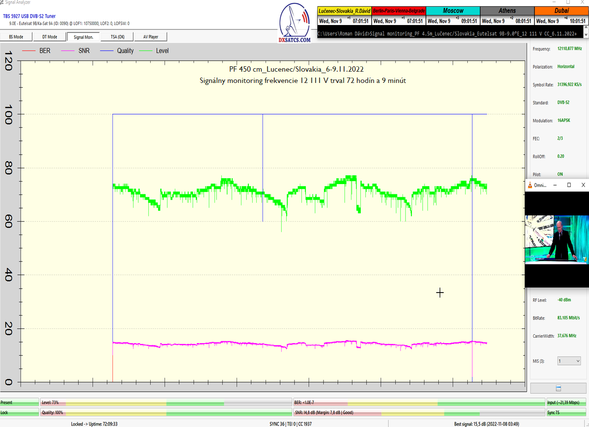 ►Priebežné stavy v signálnom monitoringu na f=12 341 MHz_V sa dokazujú v online video ukážkach,ktoré sa nedajú spochybniť.Kedže z principiálneho hľadiska platí že "Všetko sa dá spochybniť" moje argumenty znejú nasledovne : Signál s dostatočnou kvalitou sa nedá "svojpomocne vyrobiť " a priebehy a okamžité úrovne SNR,BER,Pwr... demonštrované v online video ukážkach sa nedajú zobrazovať a ani dodatočne upravovať v OFF-LINE režime,pretože ten neexistuje.To je dôvod prečo tak zdôrazňujem slovo ONLINE video ukážka