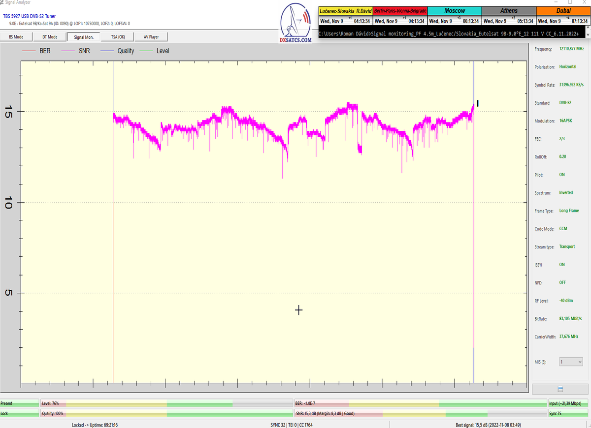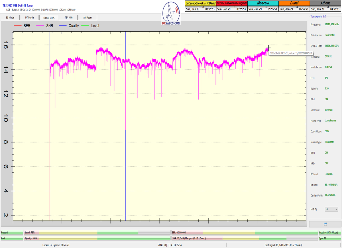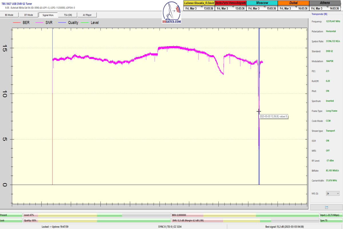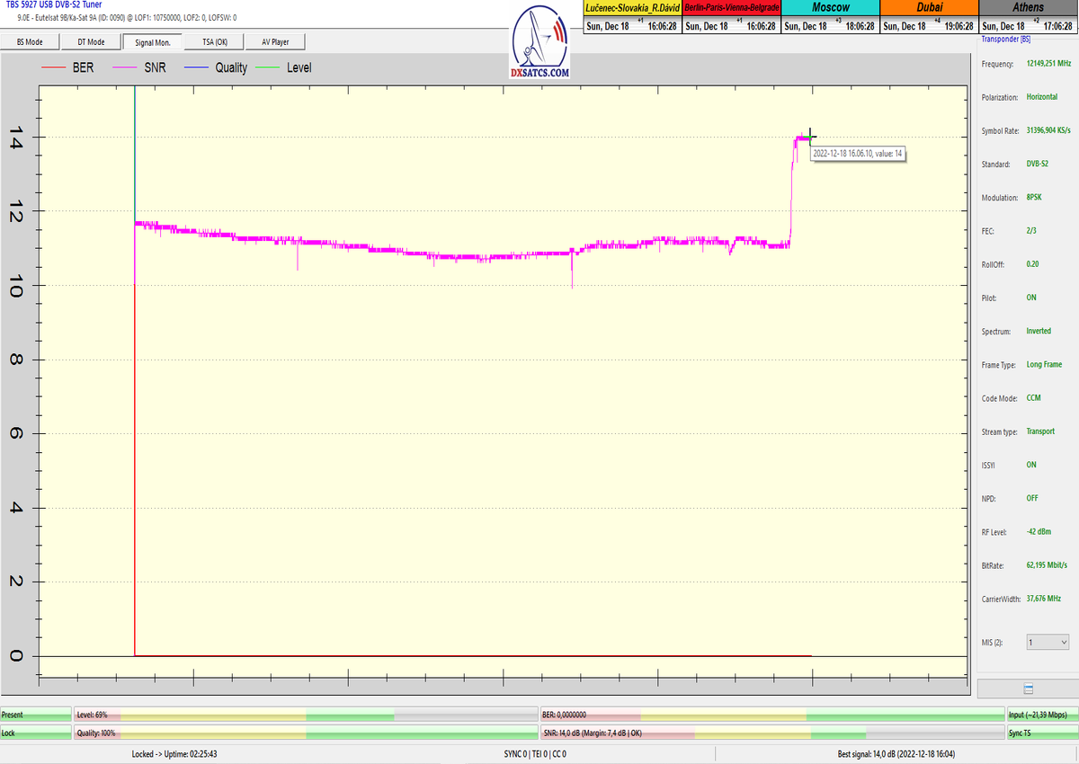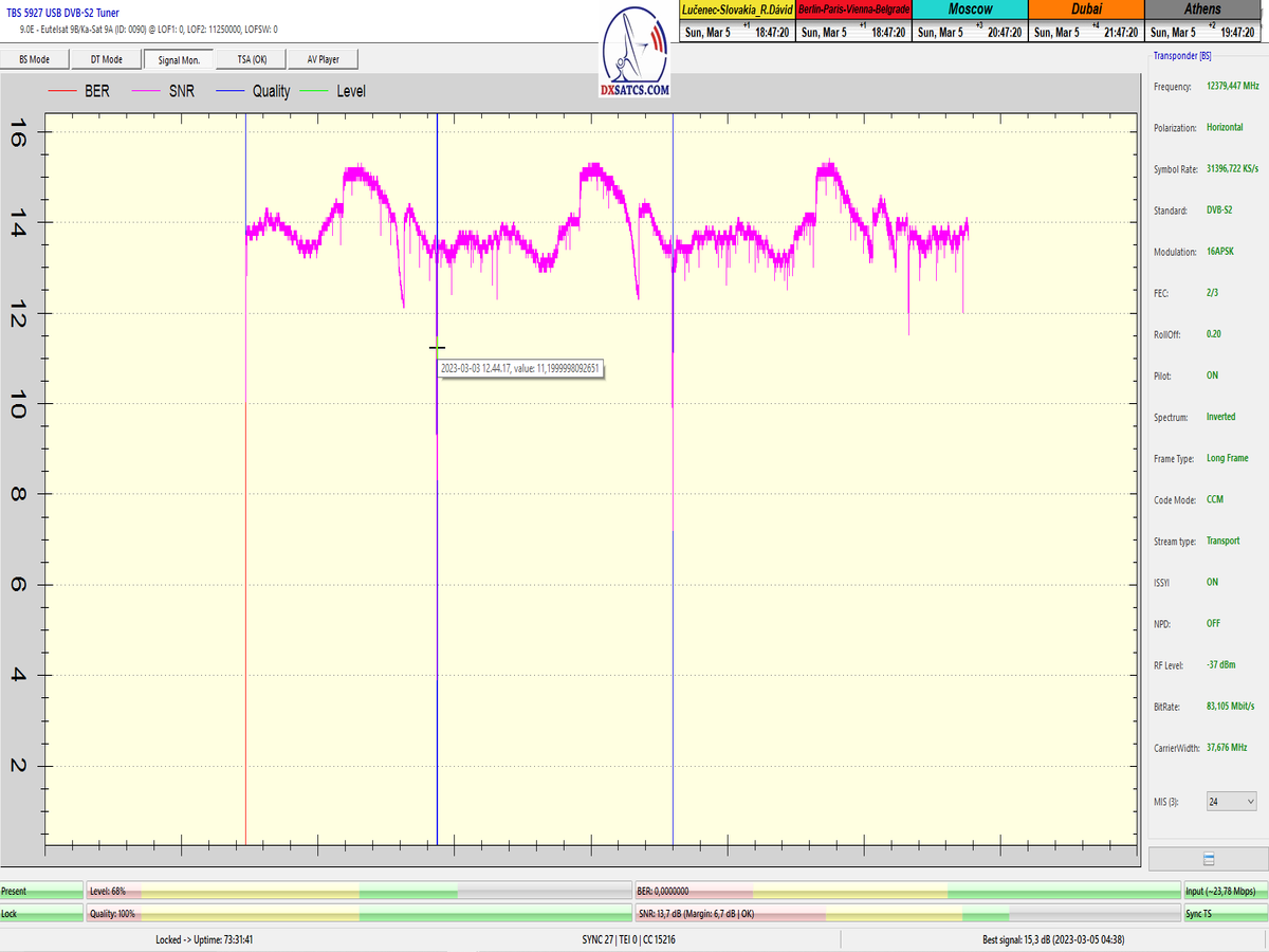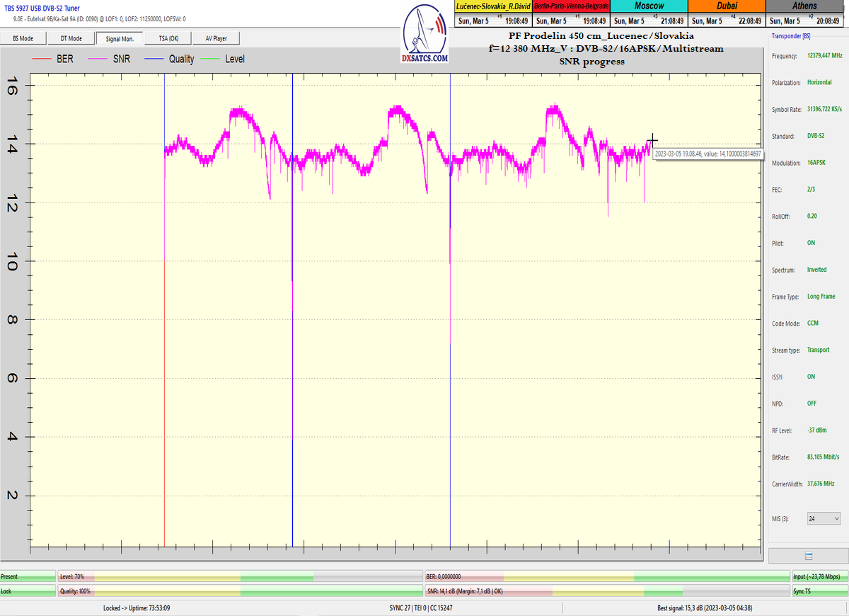 ►8.2.2023 : Na príklade dokazovania v signálnom monitoringu v dĺžke 1x73 hodín dnes nespochybniteľne dokážem začlenenie frekvencie f=12 188 MHz_V do DTH kategorizácie štandardnej formy konštantne stabilného satelitného príjmu (99,999%) s doteraz najvyššou špičkou kvality okolo SNR=15,8 dB ktorá sa opakuje každý deň.Z technologickej stránky je príjem z TP IT3 výnimočný hlavne tým že veľkosť uhlovej odchýlky SKEW ostáva konštantná aj pri výrazných zmenách v poveternostných podmienkach.Ďalej dnes dokážem plnú stabilitu príjmu v štandarde DVBS2-16APSK-Multistream aj pri intenzívnom snežení dňa 27.1.2023 so stabilnou výškou kvality okolo SNR=14,3 dB atď