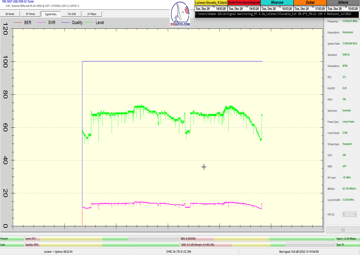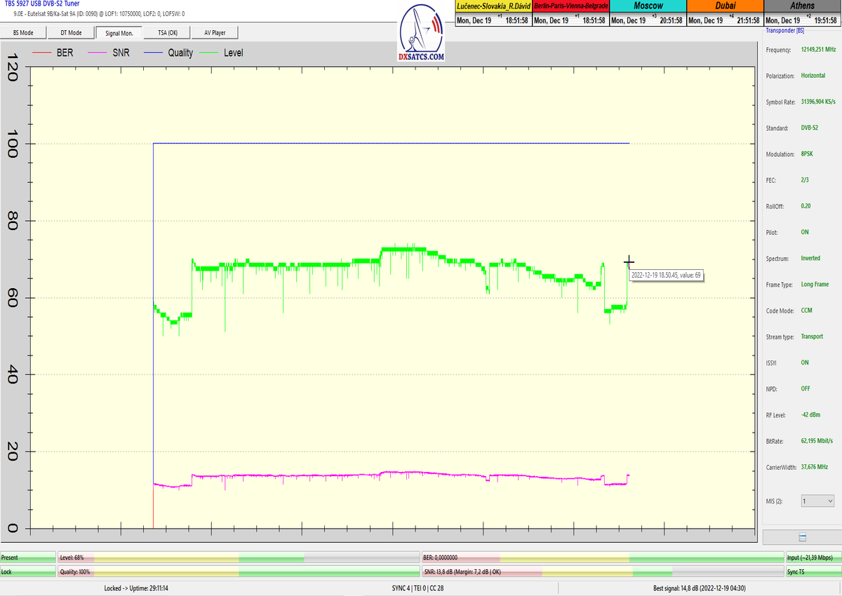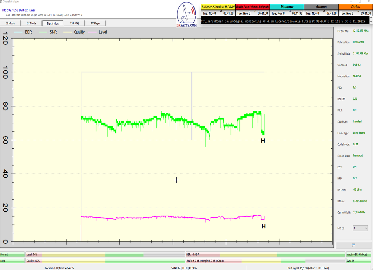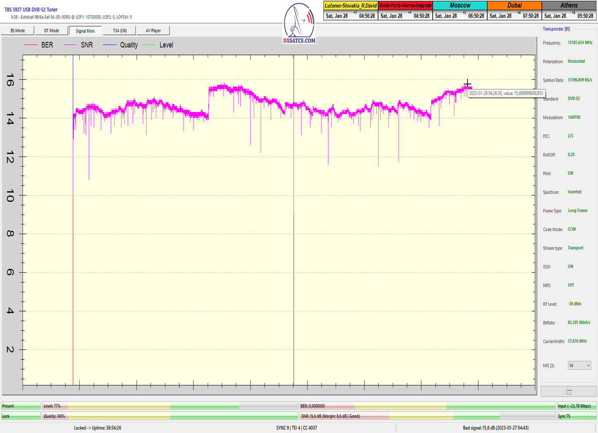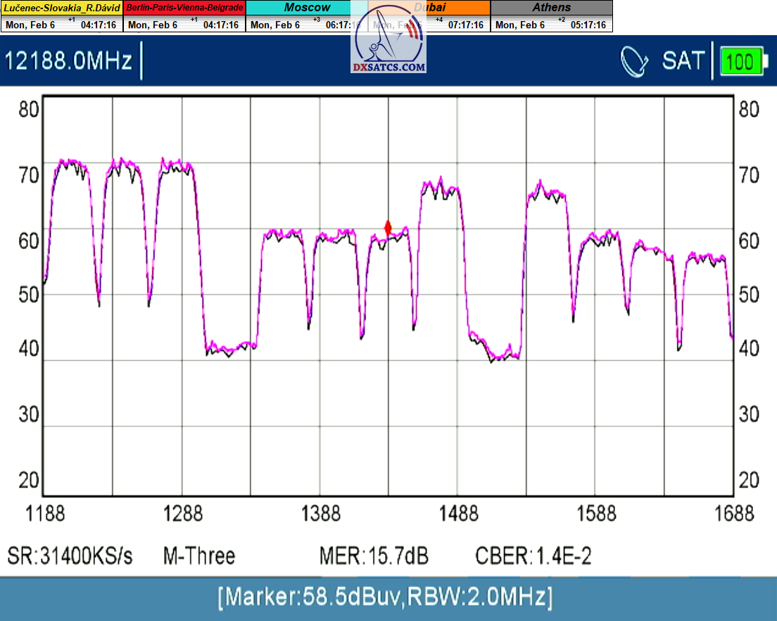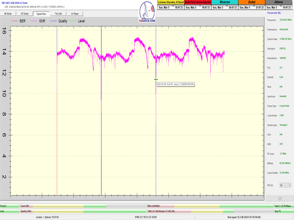 ►8.2.2023 : Na príklade dokazovania v signálnom monitoringu v dĺžke 1x73 hodín dnes nespochybniteľne dokážem začlenenie frekvencie f=12 188 MHz_V do DTH kategorizácie štandardnej formy konštantne stabilného satelitného príjmu (99,999%) s doteraz najvyššou špičkou kvality okolo SNR=15,8 dB ktorá sa opakuje každý deň.Z technologickej stránky je príjem z TP IT3 výnimočný hlavne tým že veľkosť uhlovej odchýlky SKEW ostáva konštantná aj pri výrazných zmenách v poveternostných podmienkach.Ďalej dnes dokážem plnú stabilitu príjmu v štandarde DVBS2-16APSK-Multistream aj pri intenzívnom snežení dňa 27.1.2023 so stabilnou výškou kvality okolo SNR=14,3 dB atď