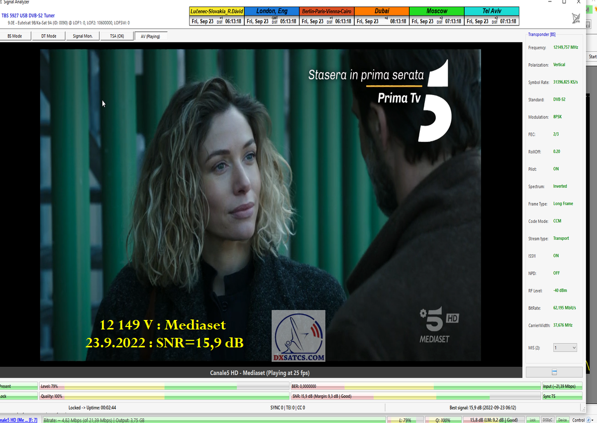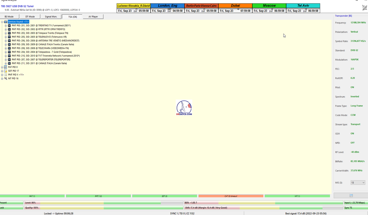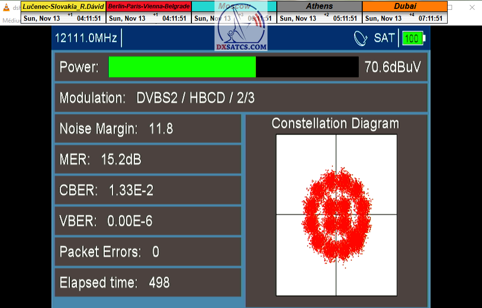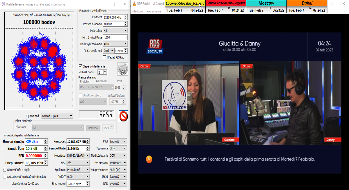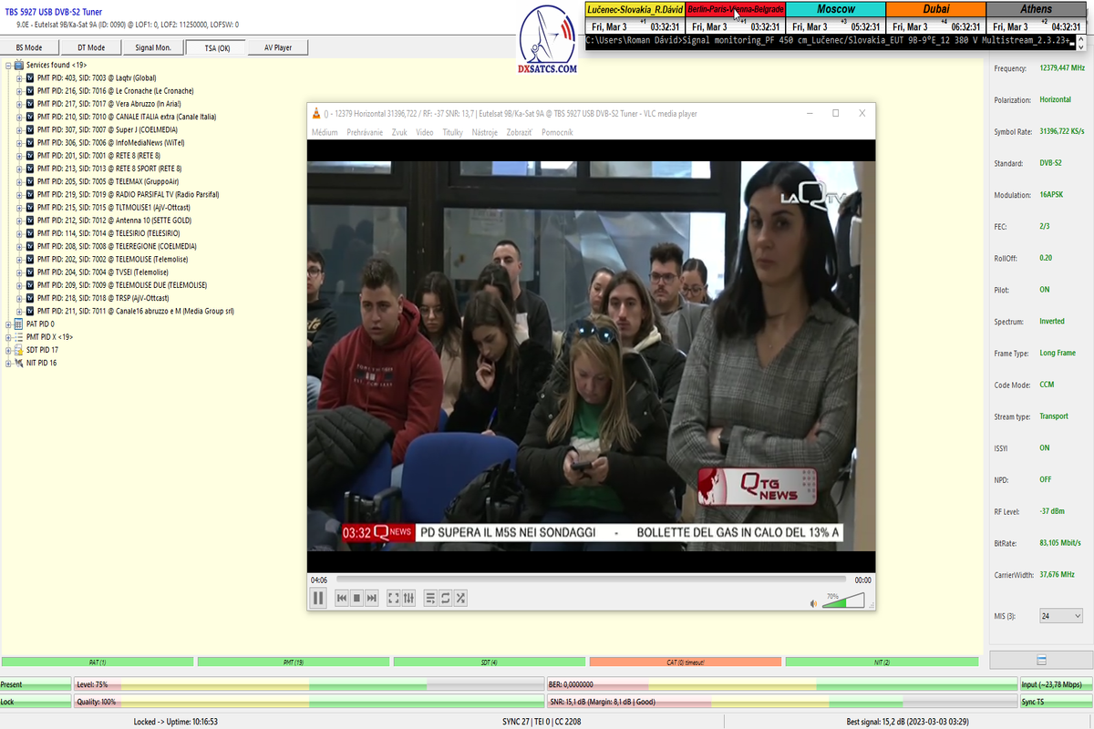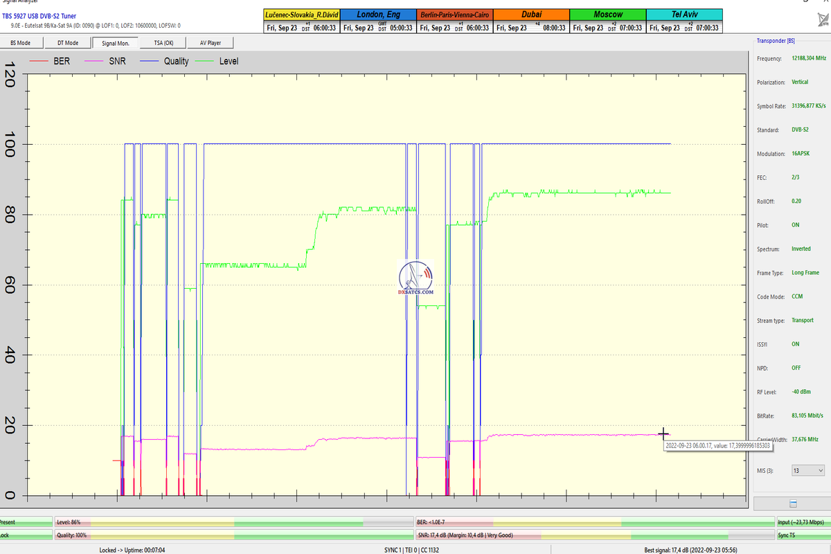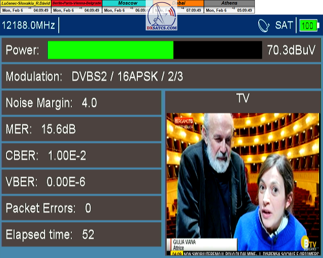 ►8.2.2023 : Na príklade dokazovania v signálnom monitoringu v dĺžke 1x73 hodín dnes nespochybniteľne dokážem začlenenie frekvencie f=12 188 MHz_V do DTH kategorizácie štandardnej formy konštantne stabilného satelitného príjmu (99,999%) s doteraz najvyššou špičkou kvality okolo SNR=15,8 dB ktorá sa opakuje každý deň.Z technologickej stránky je príjem z TP IT3 výnimočný hlavne tým že veľkosť uhlovej odchýlky SKEW ostáva konštantná aj pri výrazných zmenách v poveternostných podmienkach.Ďalej dnes dokážem plnú stabilitu príjmu v štandarde DVBS2-16APSK-Multistream aj pri intenzívnom snežení dňa 27.1.2023 so stabilnou výškou kvality okolo SNR=14,3 dB atď