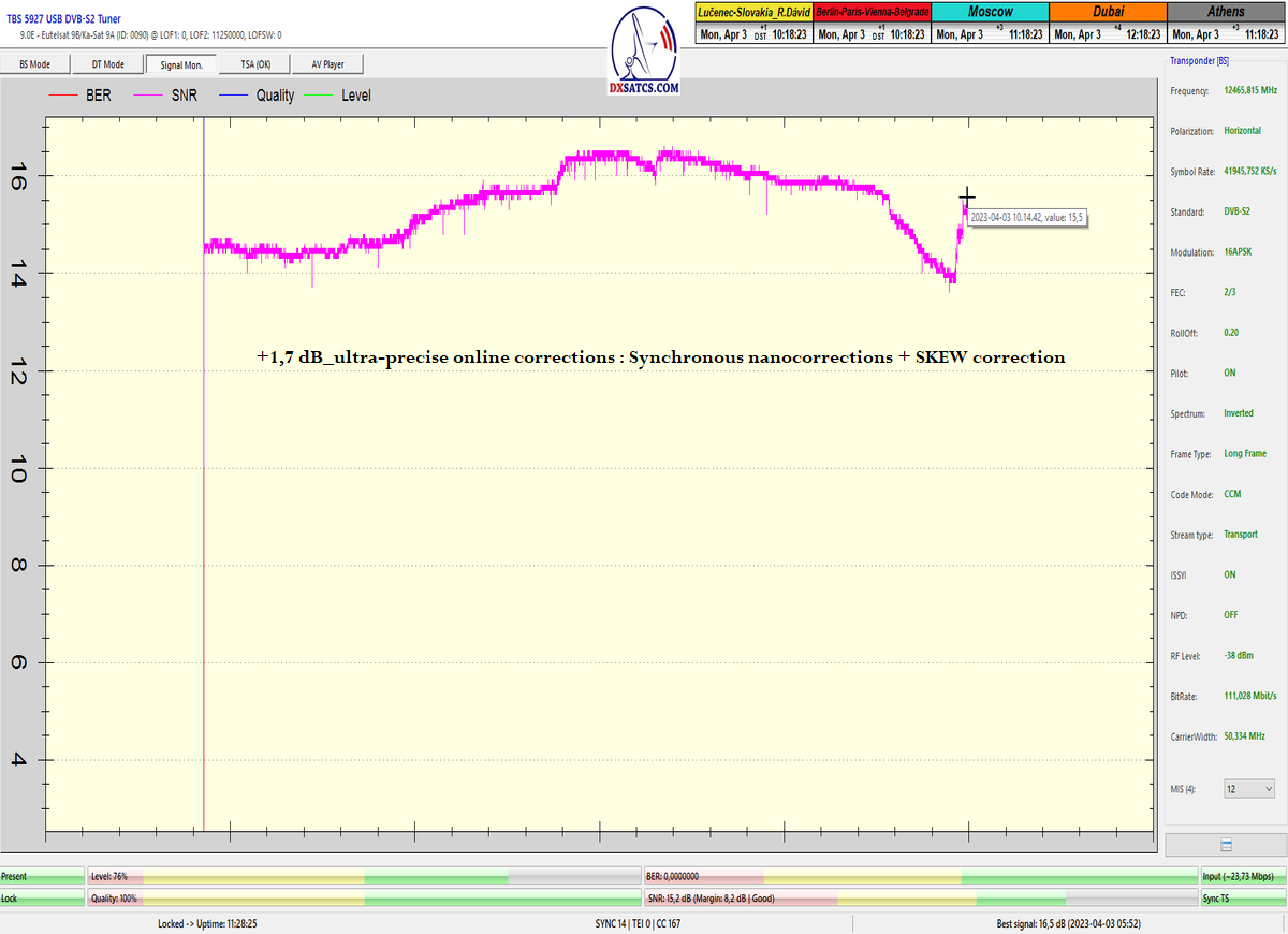 -B- : Výkon autorovej technológie "Synchrónne nanokorekcie" : dokázaný rast kvality o 3 dB_z cca 11 dB na cca 14,0 dB_SNR -skoková a nie postupná zmena v kvalite,v priebehu približne piatich sekúnd,je dôkazom že autor nehľadá/netipuje optimálnu pozíciu v danom čase pre rast kvality,ale vie úplne presne o koľko uhlových minút až sekúnd je v tom čase nutný výkon korekcií pre rast v kvalite o 3 dB.