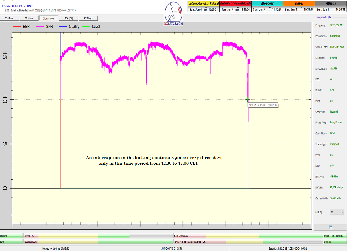 od 12 111 do 12 466 MHz_V) podarilo pretransformovať na každodennú špičku kvality okolo SNR=16,6 dB z pôvodnej špičky SNR=15,3 dB