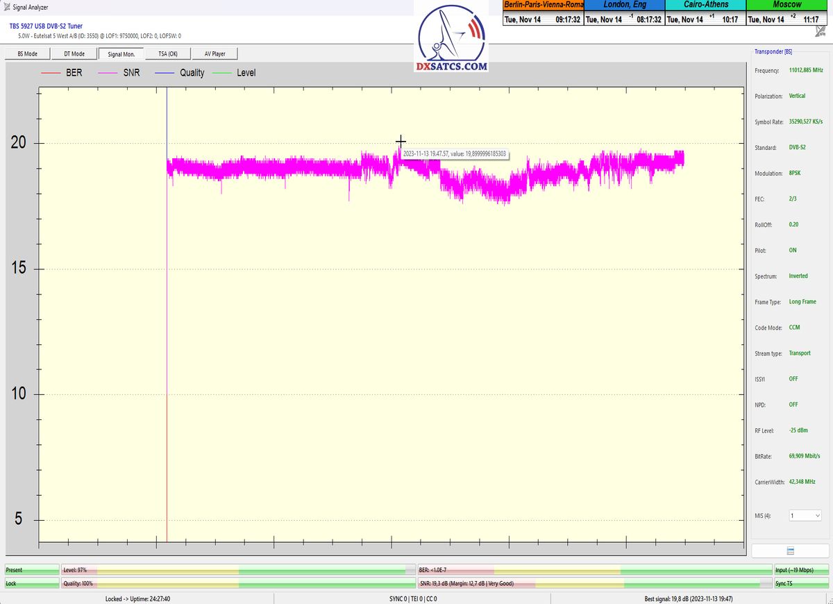 Na príklade dokazovania v podobe signálneho monitoringu paketov Rai a Canal+,vysielaných v technologickom štandarde DVB-S2/Multistream z objektu Eutelsat 5 West B na 5,0°W,Vám dnes dokážem že som účinne a hlavne stabilne transformoval relatívne vysokú intenzitu vyžiareného výkonu EIRP na výslednú kvalitu ,ktorú kvantifikujem pomerom signálu k šumu SNR=20>21+ dB-pri aplikovanej konfigurácii modulačných