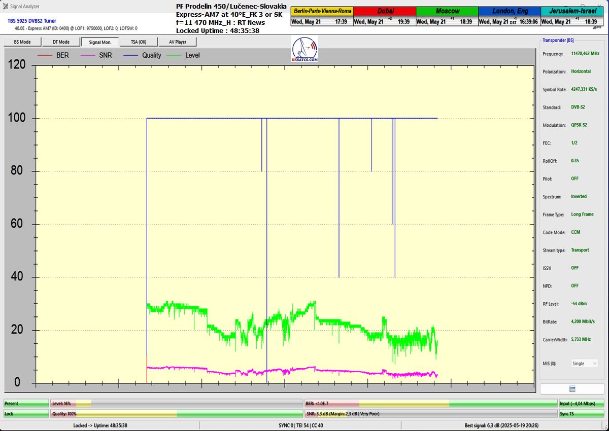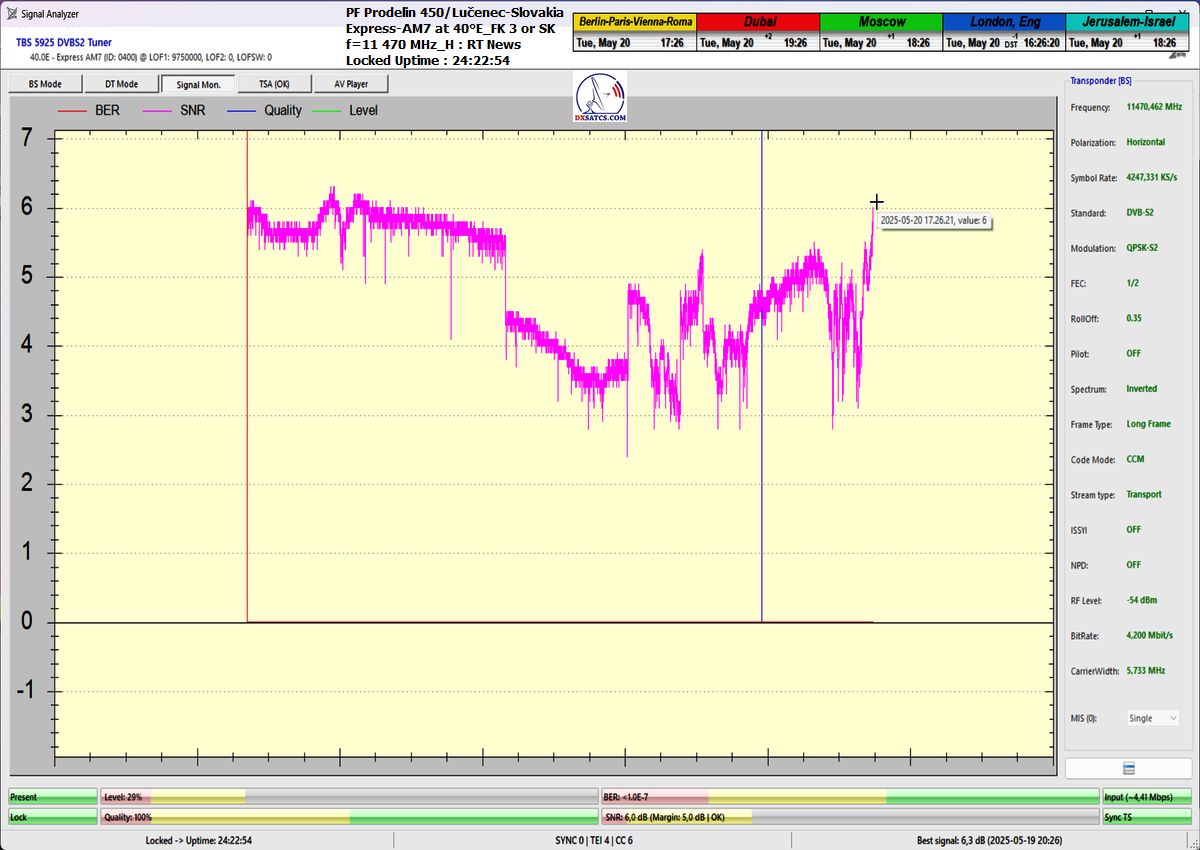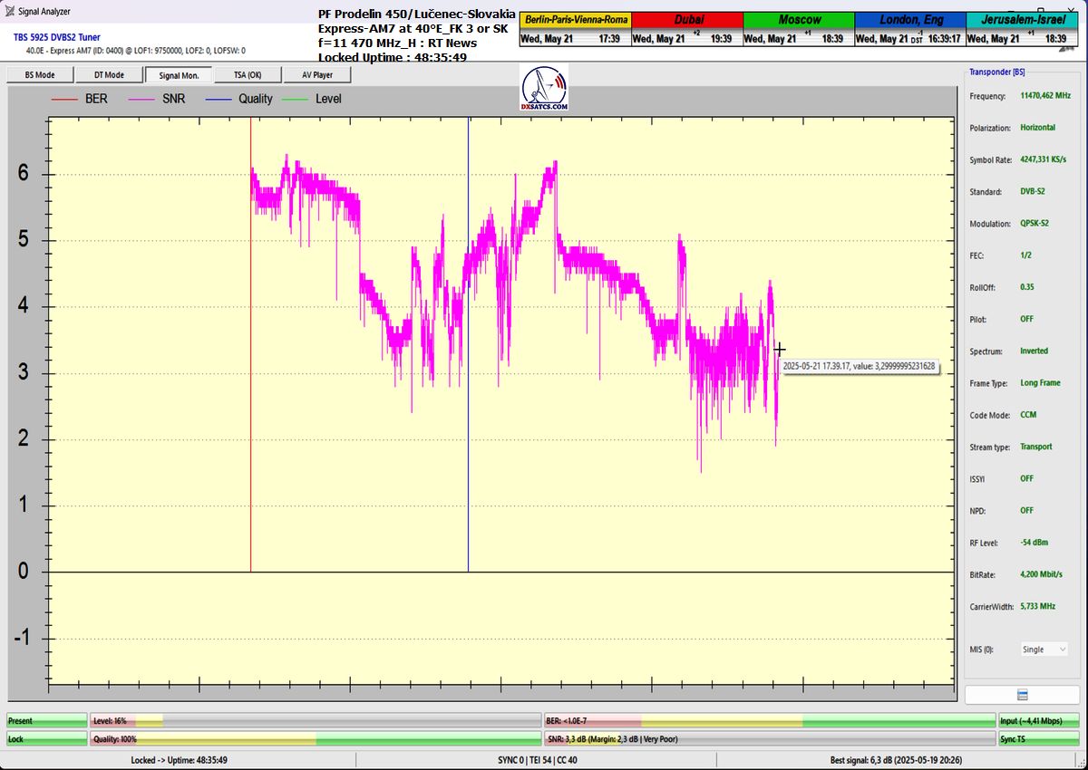 EN_Classification of achieved results at f=11 470 MHz : During the monitoring period of t = 75 hours, I achieved a peak signal quality of SNR = 6.3 dB, recorded before the arrival of several storm cloud systems, along with a quasi-ideal reception stability course without a single lock loss and only one occurrence of a one-second pixelation.This occurred despite repeated episodes of rain showers at the reception site during two out of the three total monitoring days – see supporting evidence at shmu.sk.