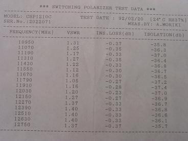 Kedže sa jedná o jednopolaritný konvertor nevihnutne som musel predradiť na jeho vstup doteraz z technického hľadiska neprekonaný mechanický polarizátor, o ktorého parametroch nám vypovedá priložený atest. Jeho úloha spočíva v správnom výbere akéhokoľvek sklonu polarizačnej roviny SKEW a dôslednom oddelení polarizačných rovín. Technické parametre mechanického polarizátora Hirschmann CSP 1210 C ako sú priechodzí útlm od 0,27dB do 0,37 dB, oddelenie polarizačných rovín -ISOLATION- od 35,7 dB do 37,4 dB sú veľmmi dobré! /v porovnaní s LNB Invacom je to o min. 10 dB lepší parameter!!! /Aj v súčasnosti sa dajú zakúpiť polarotory /mechanické polarizátory/ určené pre KU pásmo pre jednopolaritné LNB.napr: Chaparral Wideband polarotor s výborným parametrom Cross Polar Isolation nad 35 dB,čo je nemožné dosiahnúť pri univerzálnych LNB.
