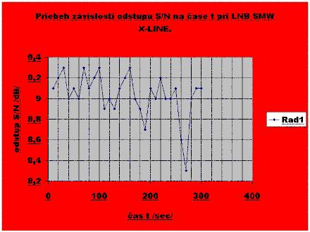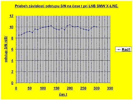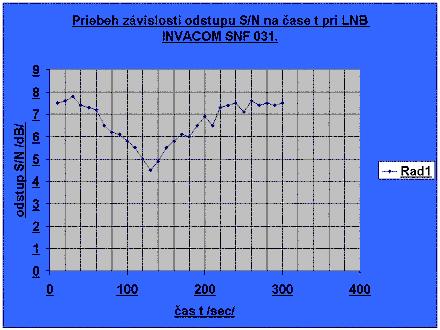 Obrázok č.5 nám znázorňuje závislosť zmeny kvality signálu meranú ako odstup S/N za časový úsek 5 minút pri LNB Invacom SNF 031. Kvalita signálu vykazovala výraznú nestabilitu a dokonca viac ako na 2.minúty sa obraz úplne stratil. Pri poklese odstupu S/N na 6 dB a BER pod hodnotu 2 krát 10 na -4 sa začal obraz rozpadať až sa úplne stratil. Tento proces sa s týmto konvertorom v závislosti na čase neustále opakoval a ani zamena počasia /vyjasnenie/ a opätovná kontrola nastavenia parametru SKEW nemala vplyv na zlepšenie odstupu S/N.