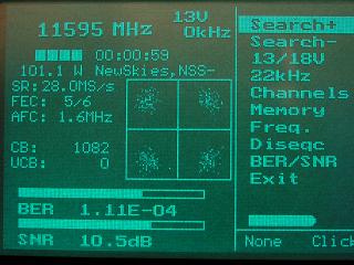 Pri prvotnom ladení príjimacej antény na družici NSS 6 /95° východne/ bolo nevihnutné pootočiť konvertor, oproti vypočítanému sklonu polarizačnej roviny -41°, o ďalších 20°, lebo inak bolo možné príjimať len internetových provajderov PlanetSky, Streamlink, FalconStream a to tiež len na hranici signálnej stability. Televízie KTR a CGN sa zachytiť nedali vôbec. S použitím meracej techniky som čo najpresnejšie nastavil sklon polarizačnej roviny SKEW pri tomto konvertore. O dosiahnutých kvalitatívnych signálnych parametroch S/N,BER... s LNB INVACOM SNF 031 informujú nasledovné grafy a fotografie z meracieho prístroja.
