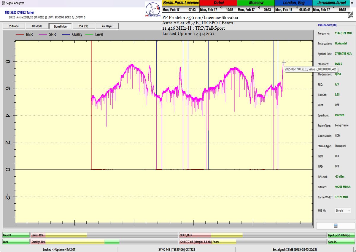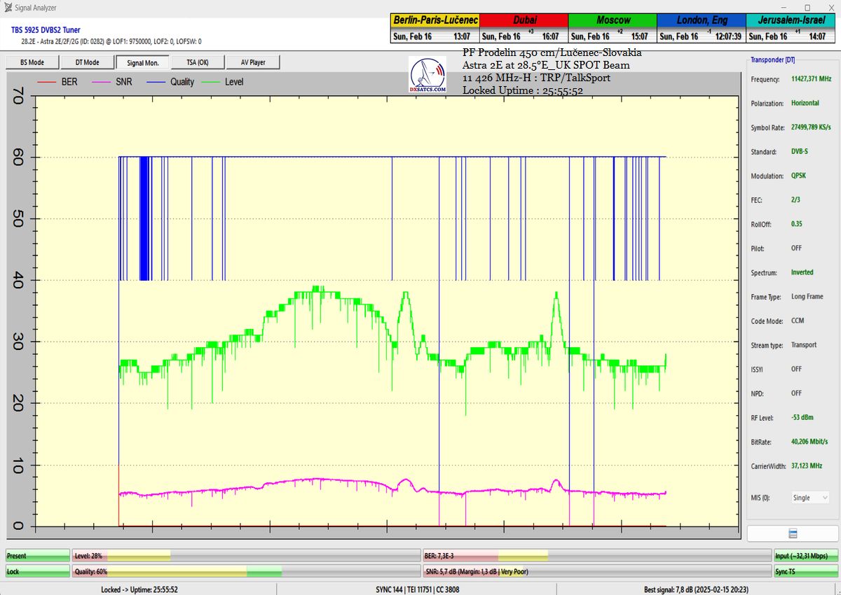 ►EN_TRP/TalkSport: Demonstrable high profit gains of over 2 dB when replicating the signal model into the antenna system using my technology "Synchronous Nanocorrection" while receiving transponder TP 115 from satellite Astra 2E at 28.5°E in the UK SPOT BEAM footprint in Lučenec in southern central Slovakia, with an output from a 450 cm dish.