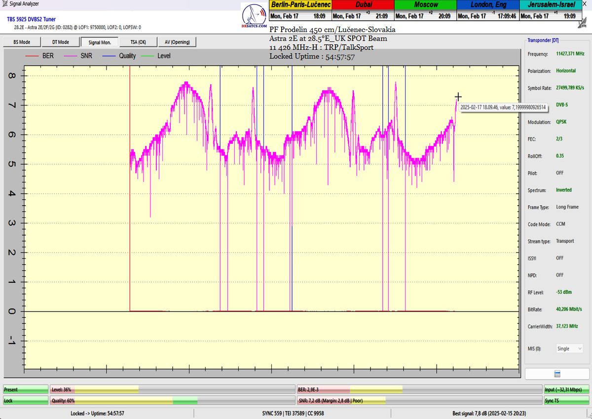 ►DE_TRP/TalkSport: Nachweislich hohe Gewinnsteigerungen von über 2 dB bei der Replikation des Signalmusters in das Antennensystem mittels meiner Technologie "Synchronisierte Nanokorrektur" beim Empfang des Transponders TP 115 von Satellit Astra 2E auf 28,5°E im UK SPOT BEAM-Bereich in Lučenec im Süden der zentralen Slowakei, mit einem Ausgang von einer 450 cm Antenne.