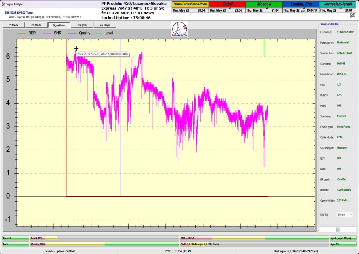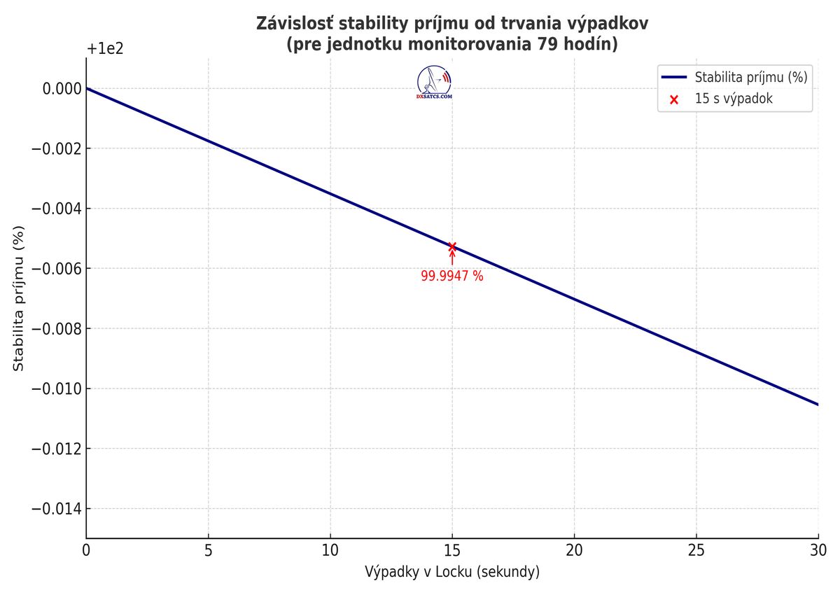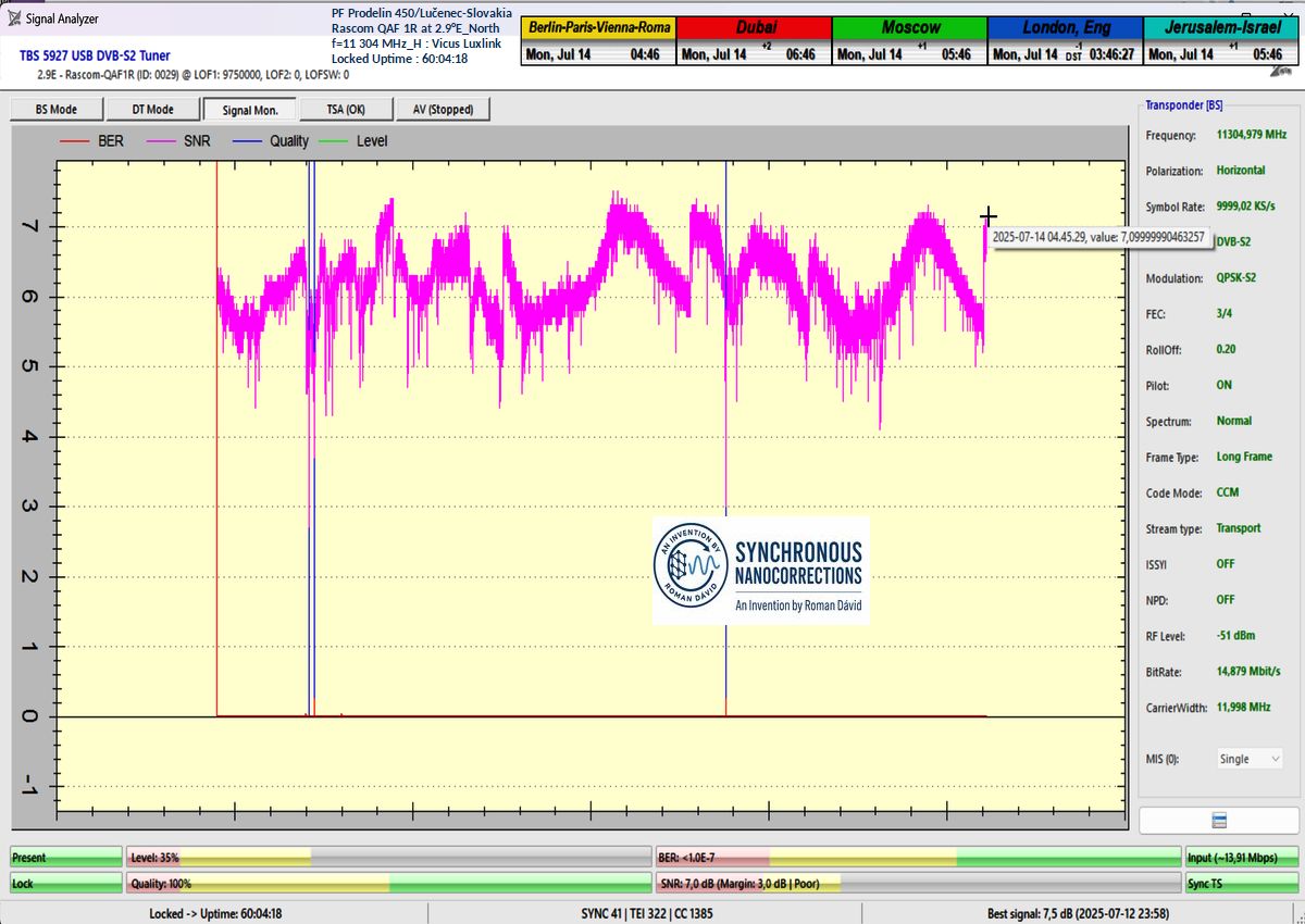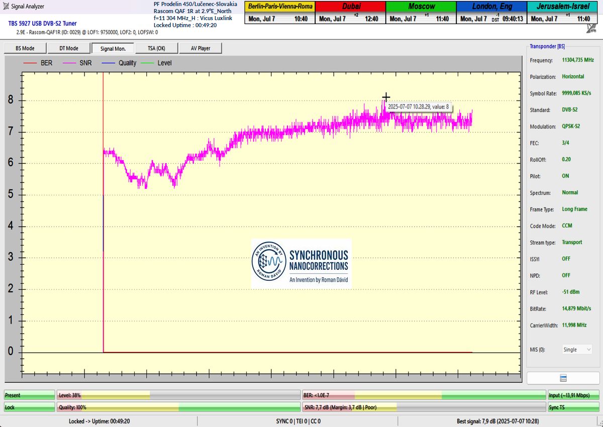 SK_Ako potvrdzuje vizualizovaná forma dokazovania v signálnom monitoringu s trvaním t = 79 hodín (čo predstavuje presne 284 400 sekúnd), výpadky v Locku alebo oscilácie kvality v okolí šumového prahu sa vyskytli v celkovom trvaní iba pätnásť sekúnd z celkových 284 400 sekúnd. To zodpovedá percentuálnej stabilite príjmu na úrovni presne 99,99 %.Jediným garantom dosiahnutej stability príjmu na frekvencii f = 11 304 MHz_H je — ako to následne dokazuj— technologický vynález s názvom Synchrónne nanokorekcie, ktorého autorom je vedec a vynálezca Roman Dávid z Lučenca. Tento vynález zabezpečuje náhle a skokové zlepšenia kvality príjmu, ktoré okamžite zvyšujú signálnu rezervu v rozsahu od +0,5 do +2,5 dB.