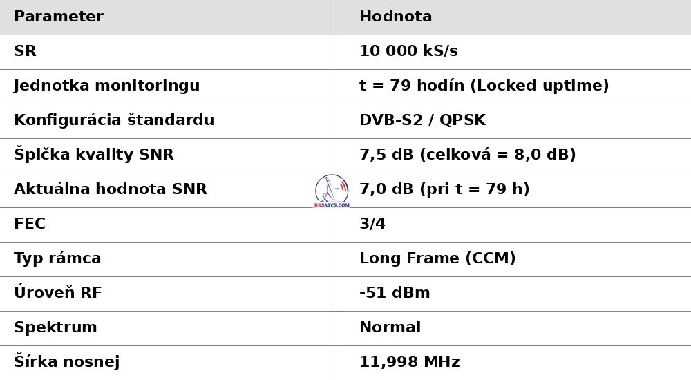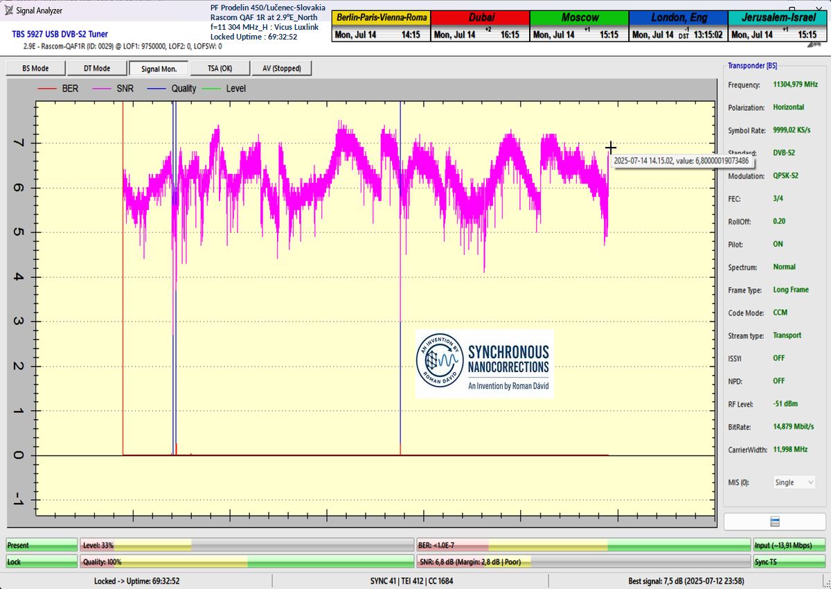 DE_Wie durch die visualisierte Form des Nachweises im Rahmen der Signalüberwachung mit einer Dauer von t = 79 Stunden (was exakt 284 400 Sekunden entspricht) verifiziert wurde, traten Ausfälle im Lock-Zustand oder Qualitätsschwankungen in der Nähe der Rauschschwelle lediglich über eine Gesamtdauer von fünfzehn Sekunden innerhalb des gesamten Intervalls von 284 400 Sekunden auf. Dies entspricht einer Empfangsstabilität von exakt 99,99 %.Der alleinige Garant für die erreichte Empfangsstabilität auf der Frequenz f = 11 304 MHz_H ist – wie im Folgenden nachgewiesen – die technologische Erfindung mit dem Titel Synchrone Nanokorrekturen, entwickelt vom Wissenschaftler und Erfinder Roman Dávid aus Lučenec. Diese Innovation bewirkt plötzliche Sprünge in der Empfangsqualität, die die Signalreserve sofort im Bereich von +0,5 bis +2,5 dB erhöhen.