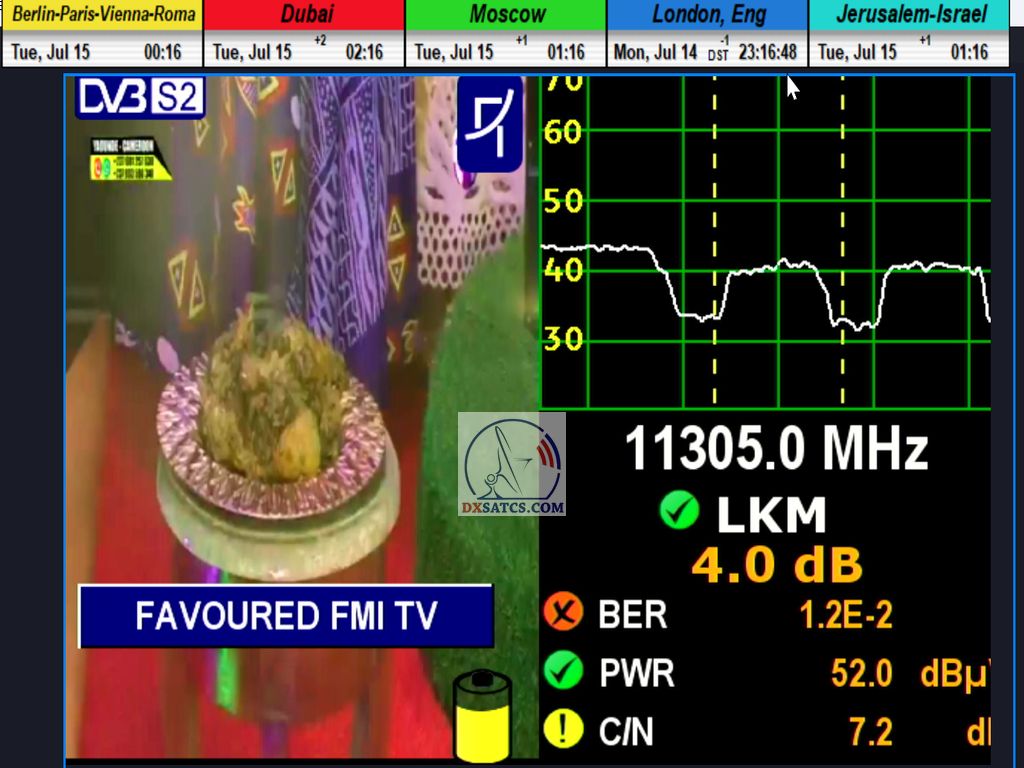 >DE_Verifizierung der technologischen Erfindung „Synchron-Nanokorrekturen“ durch den Wissenschaftler und Erfinder Roman Dávid aus Lučenec beim Satellitenempfang aus dem Footprint von NORTH Africa in Mitteleuropa, wo sie sich als einziger Garant für die Erreichung einer Empfangsstabilität von 99,99 % unter dynamisch variablen Signalbedingungen mit häufigen und unregelmäßigen Leistungseinbrüchen (EIRP) erwiesen hat.