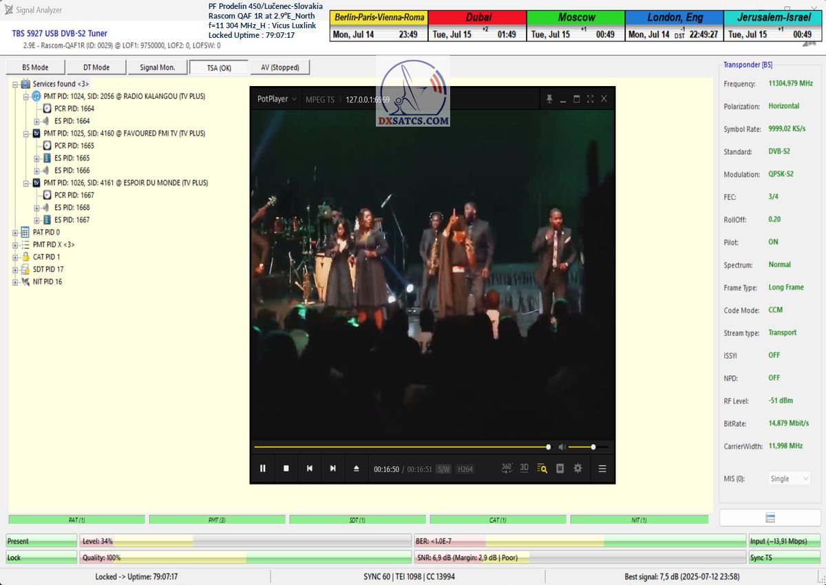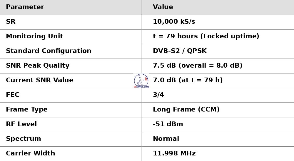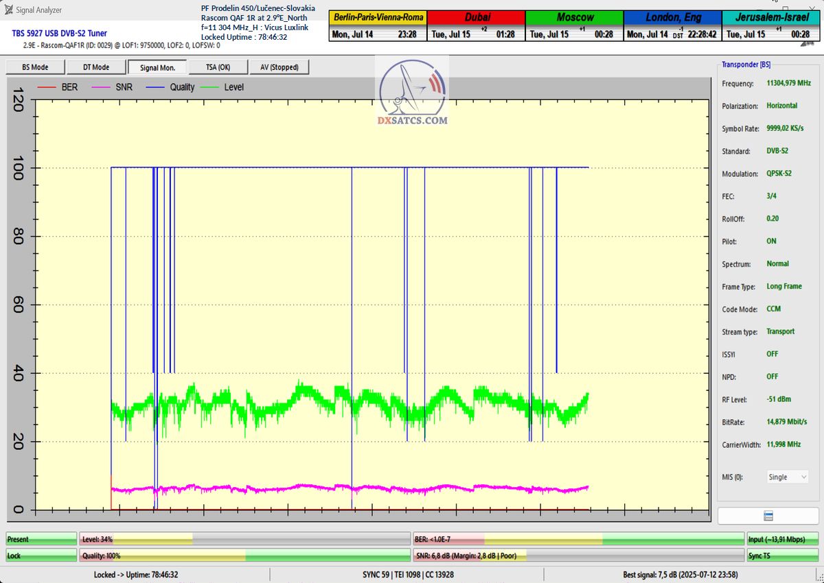 ►EN_Classification of achieved results at f=11 305 MHz : As confirmed by the visualized form of verification in the signal monitoring over a duration of t = 79 hours (which corresponds exactly to 284,400 seconds),Lock losses or quality oscillations near the noise threshold occurred for a total of only fifteen seconds out of the full 284,400 seconds.This corresponds to a reception stability rate of exactly 99.99%.