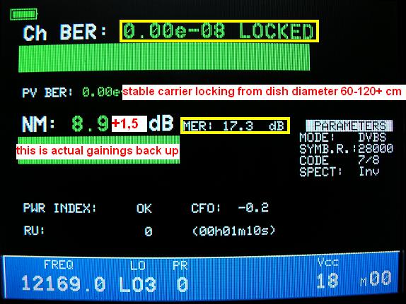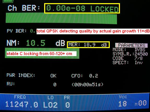 -typický akostný priebeh stabilne nulovej okamžitej chybovosti Ch BER pri FEC 7/8 s výraznou amplitúdou zisku vyjadrenou v jednotke Modulačná Chyba MER=11+ dB sú v prípade EIRP toku dostupného zo satelitov Thor 3+5 typickým kvalitatívnym priebehom závislosti vzrastu zisku resp.detekčnej kvality so vzrastom aktívnej reflektorovej plochy D .